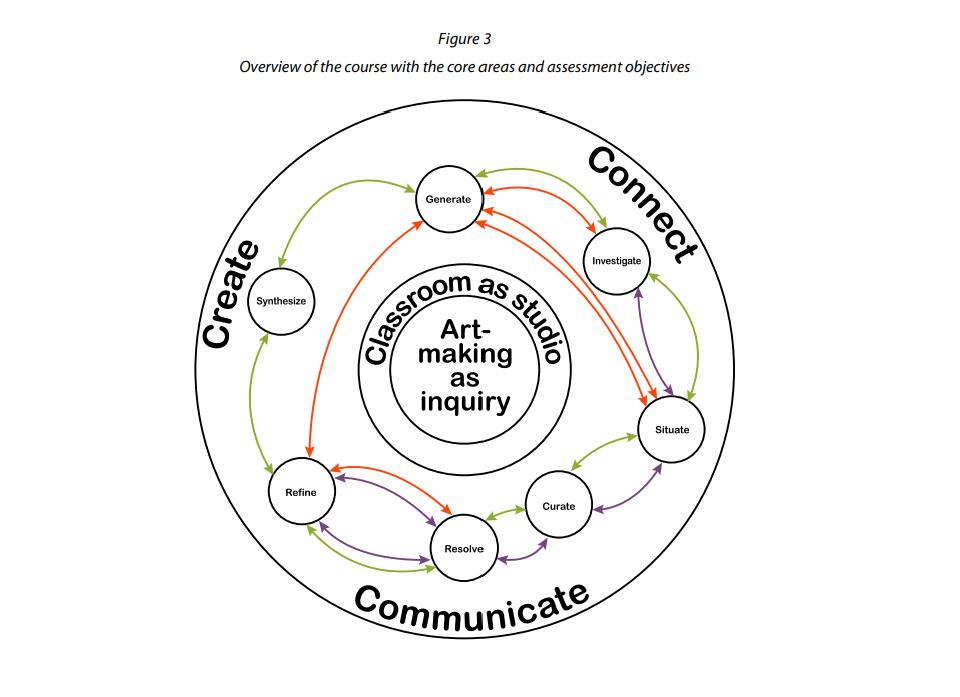 As illustrated in Figure 3 (on the next page), art-making as inquiry is at the centre of the syllabus. Learning through three core areas create, connect, and communicate in the classroom as studio allows students to fulfil the seven assessment objectives for the course while engaging with the creative process as they choose. Figure 3 illustrates some possible ways to do this, but there is no prescribed path and not all objectives need to be fulfilled in every inquiry the student undertakes.