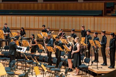 The Festival Symphonic Wind ensemble comprising 70 Woodwind, Brass and Percussion players, ranging from Year 3 up to Year 13 were next on stage as they performed 2 contrasting pieces under the baton of Ms French and Mr Baxter. It was wonderful to see our emerging Woodwind and Brass players playing alongside older and more experienced students, and the richness of the sound filled the auditorium