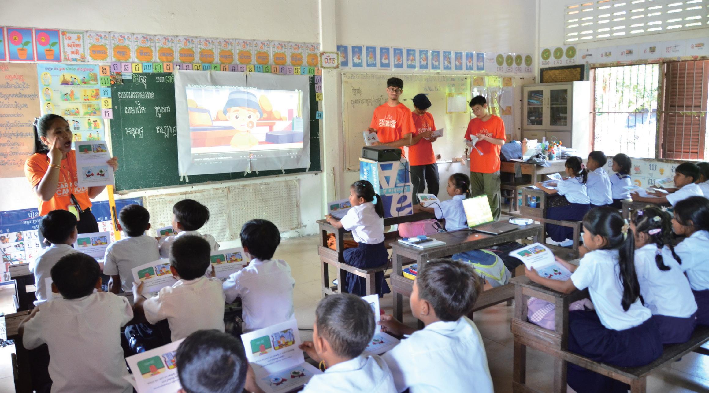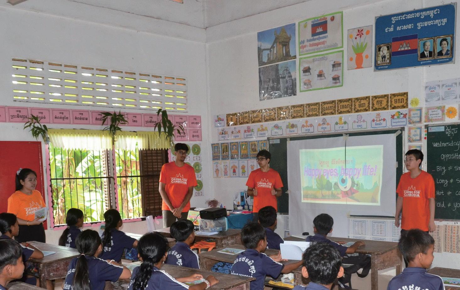 From left to right: Arnav and Anish collaborating with a team from Caring for Cambodia to work with children in a classroom in Cambodia.