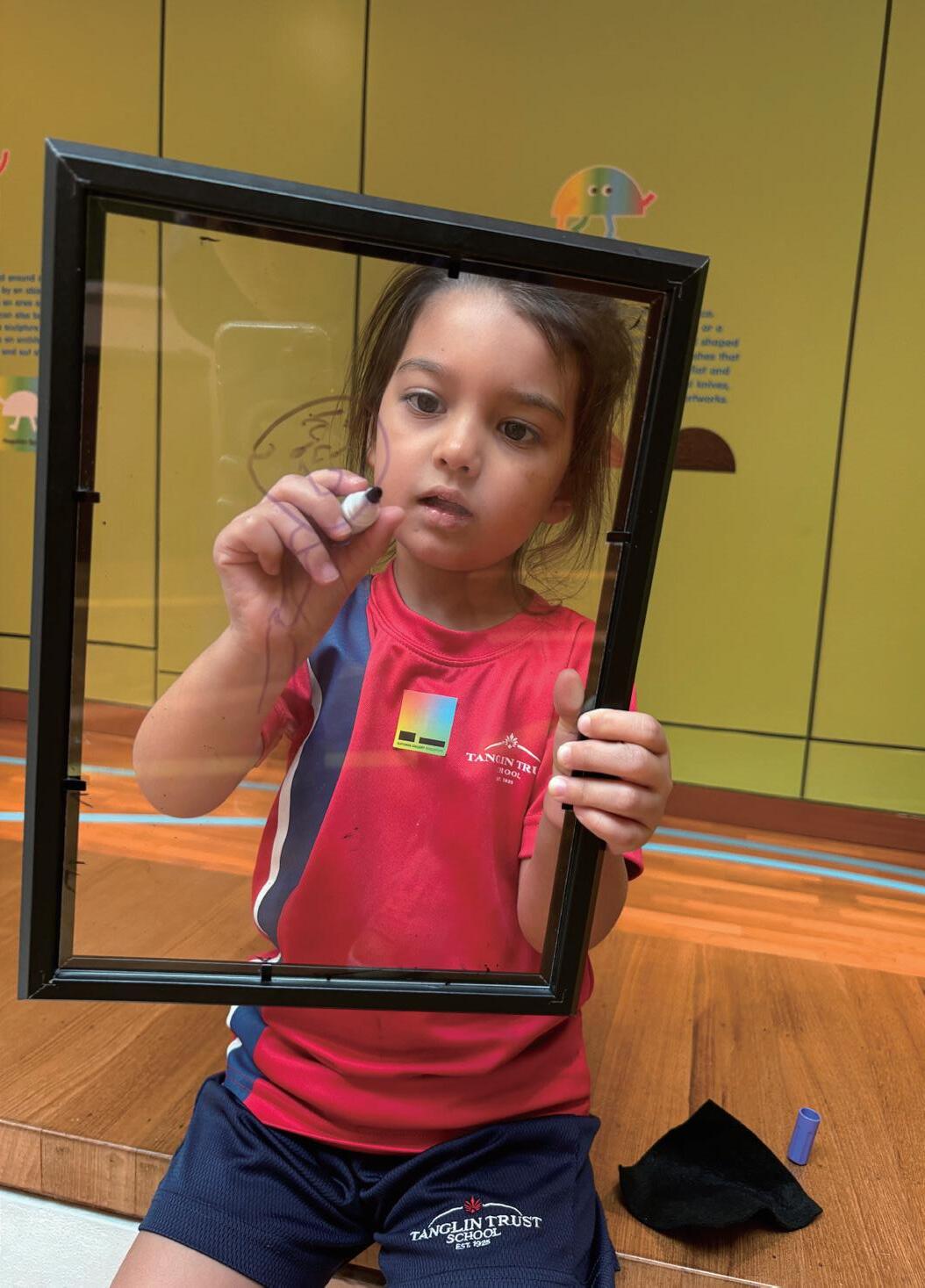 Inside the Keppel Centre, the children are immediately captivated by the colourful and hands-on exhibits. At the light box tables, they experiment with translucent coloured shapes, arranging and layering them to create their own abstract designs. Their faces light up with wonder as their creations are projected onto the walls around them, transforming their small table-top experiments into large-scale, glowing artworks. This experience encourages the children to think about colour, composition, and collaboration, all while having fun and expressing themselves freely.
