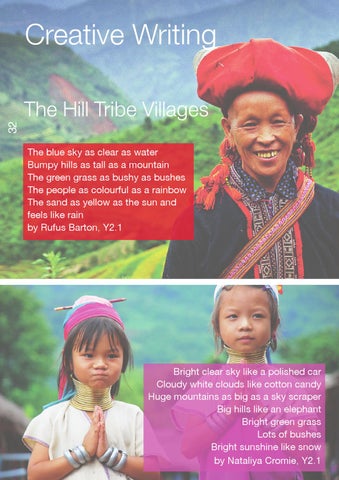The Hill Tribe Villages The blue sky as clear as water Bumpy hills as tall as a mountain The green grass as bushy as bushes The people as colourful as a rainbow The sand as yellow as the sun and feels like rain by Rufus Barton, Y2.1
