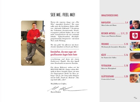 verarbeitung und dann mit einem Zauberwort: Haptik. Also dem Appell einer Drucksache an unseren Tastsinn. Für diesen Mehrwert stehen wir bei BEISNER DRUCK. Einige schöne Beispiele in dieser Ausgabe zeigen, wie man via Fingerspitzen direkt ins Herz gelangt! Ach ja, der Song endet übrigens mit der Zeile „Touch me. Heal me“. Das sagt doch alles, oder?