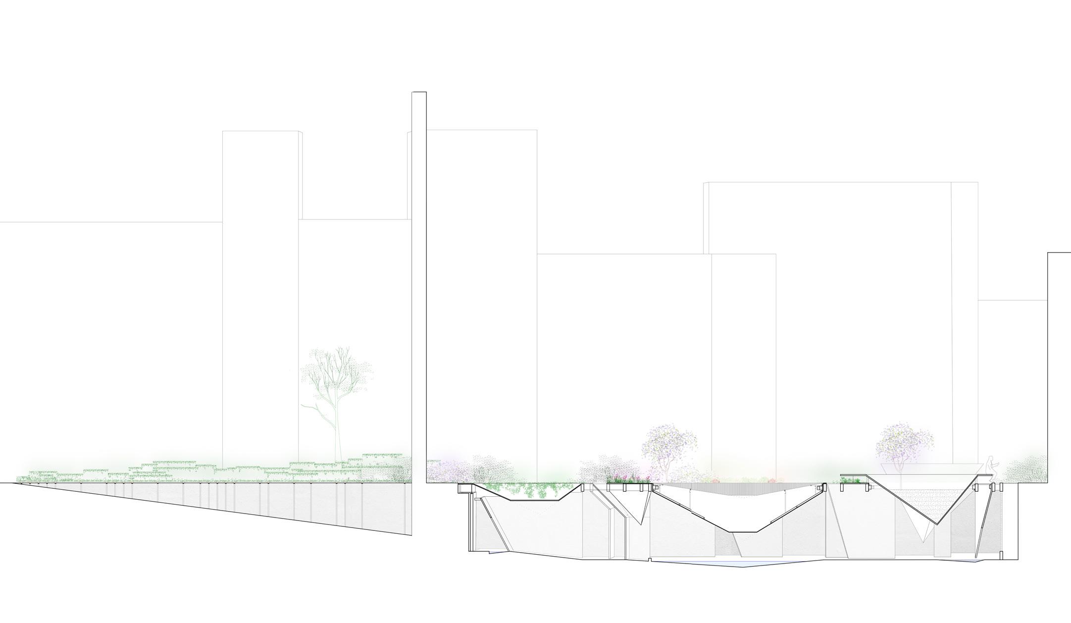 FRANCESCO ISIDORI, HEIKE HANADAThe garden is a place for serenity, deep contemplation, and seeking peace. Lying in one of the busiest areas of Rome, entering the garden through three different perspectile pockets is a deeply mysterious Roman experience. As one wanders around inverted pyramids acting as fountains and plant pots, each corner turns into an opportunity for a new spatial experience. Down below lies the misty grotto. Reached by three ramps placed inside the entry pockets, the grotto is dark, humid, wet, and sacred. One feels the weight of the world on their head as they make their way around the inverted pyramids, and become the threshold between above and under.