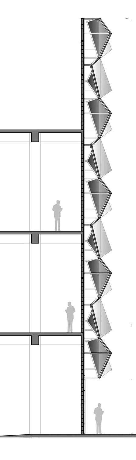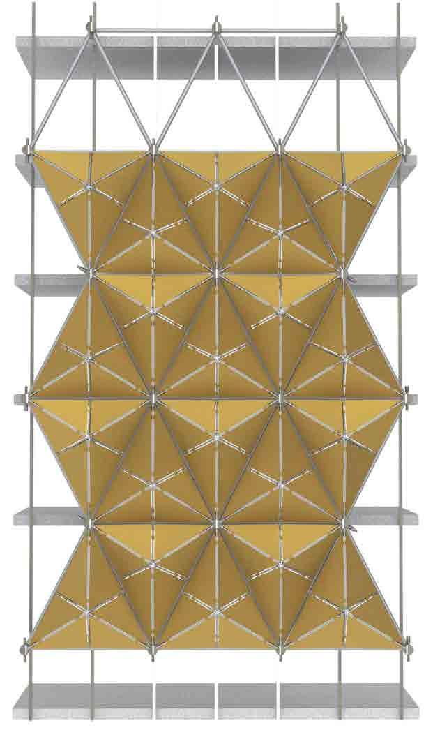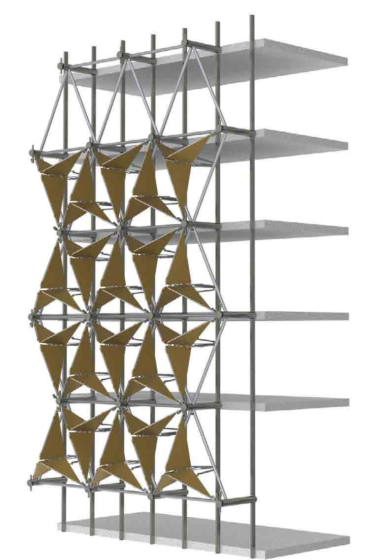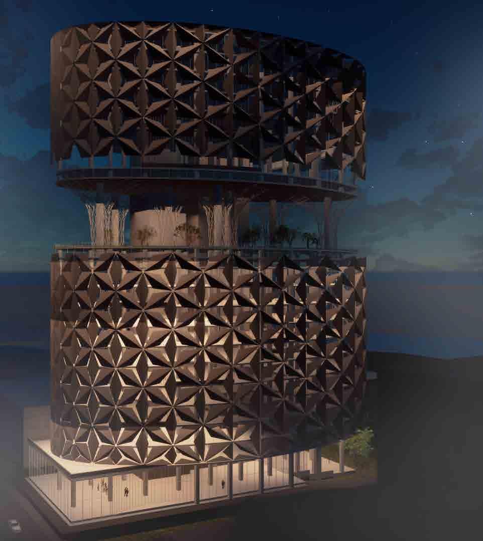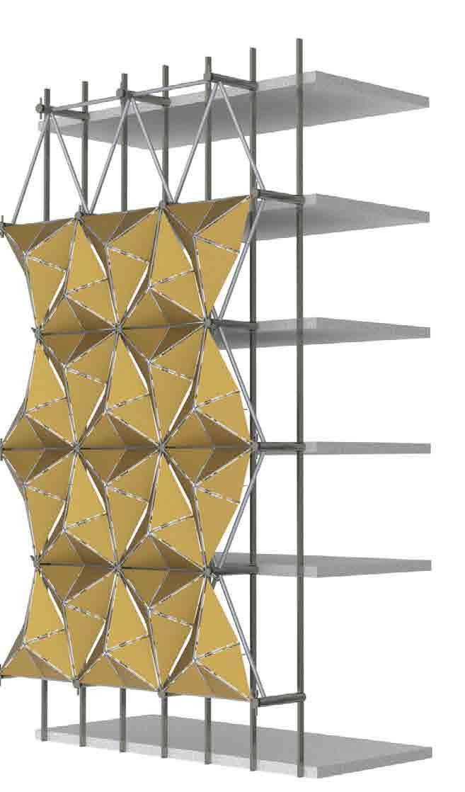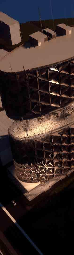 and simulated on Grasshopper, it is designed to respond to the movement rays recede. When simulated for solar heat gain, along with the curved provides a dynamic and ever-changing aesthetic, reflecting the city’s