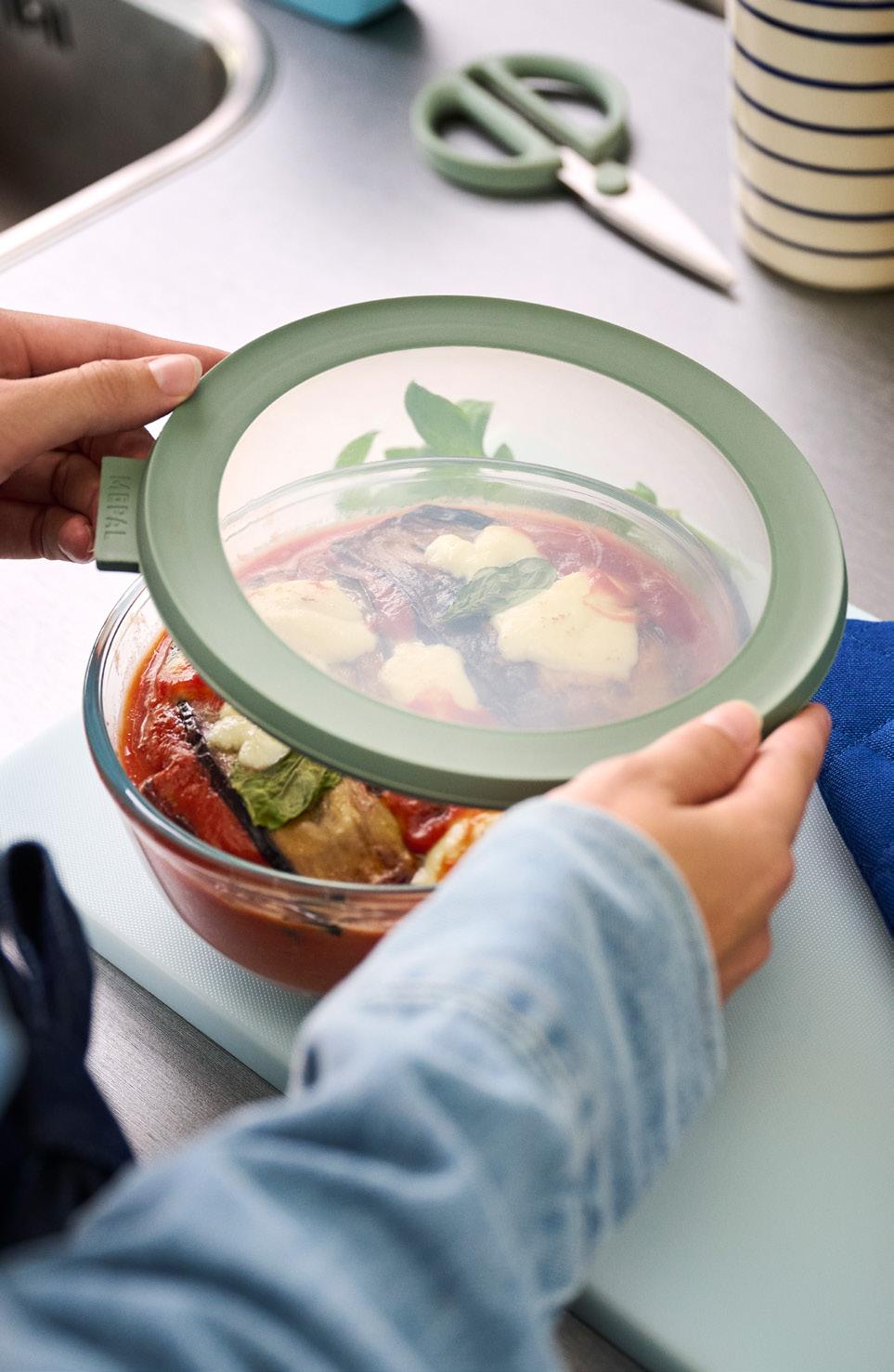 Le bol Cirqula en verre est idéal pour le four, le micro-ondes (sans couvercle) et le réfrigérateur, et se ferme hermétiquement avec un couvercle transparent et un bord couleur Nordic sage, conservant parfaitement fraîcheur et arômes. Le couvercle EasyClip amélioré rend l’ouverture et la fermeture encore plus faciles et agréables.