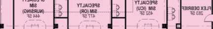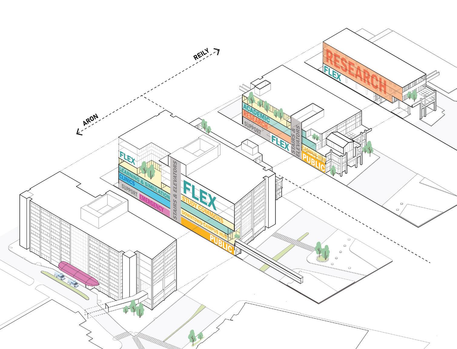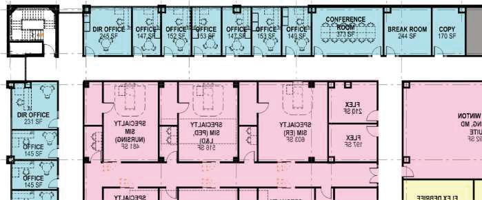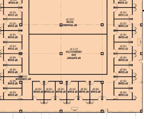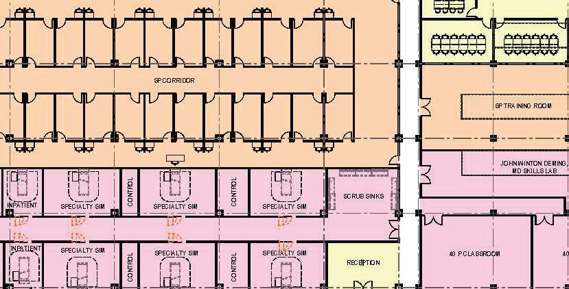 This scheme places reception, classrooms, and debrief in the center of the plan, close to the primary elevator lobby. The SIM and SP suite are placed on either side of the shared zone, with SP extending into the Reily expansion zone. The SP suite is laid out in a horseshoe, with three sets of 6-8 exam rooms surrounding a central SP lounge and training spaces lit from above by two skylights. The SIM suite separates specialty SIM, Inpatient and Clinical exam SIM areas to maximize flexibility.