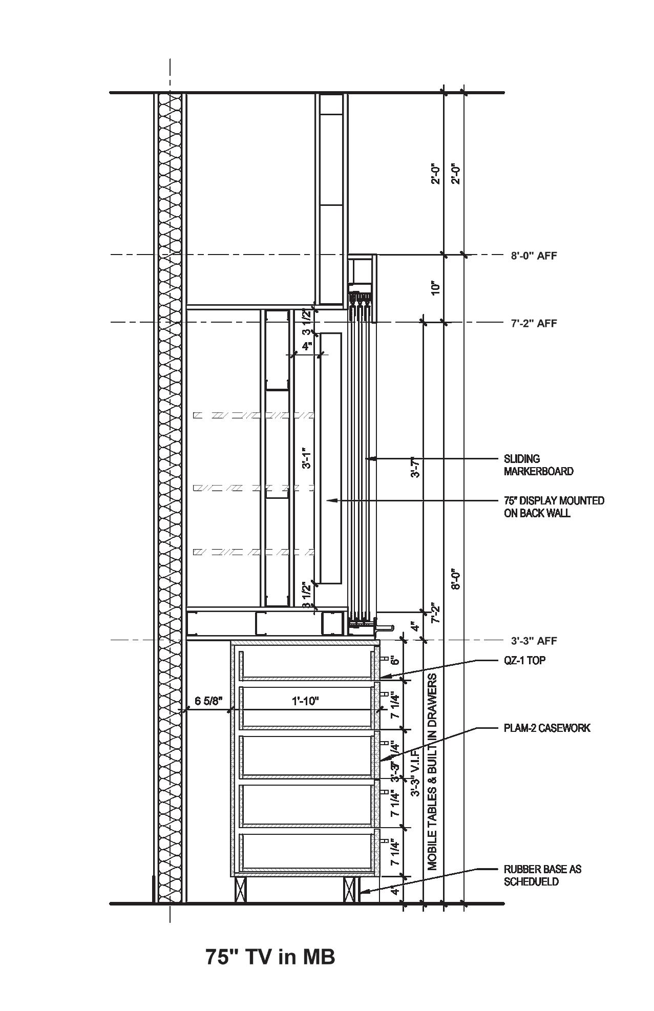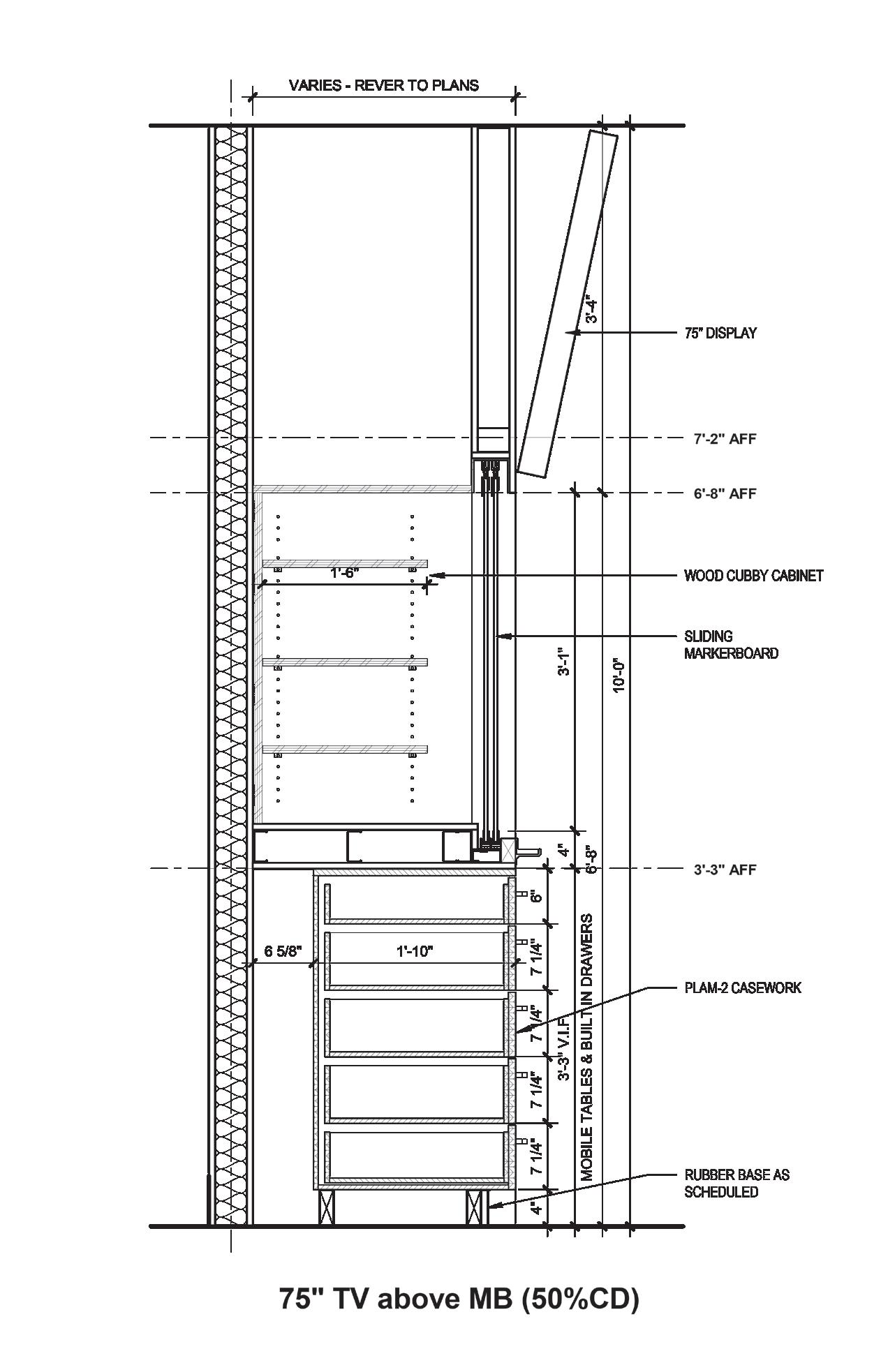 Millwork detail sheet highlighting details for the teaching lab wall from the final construction documentation set.