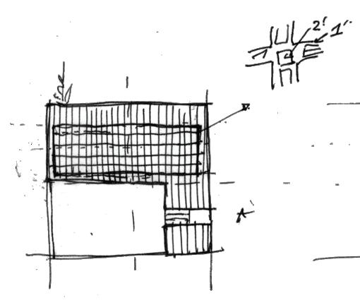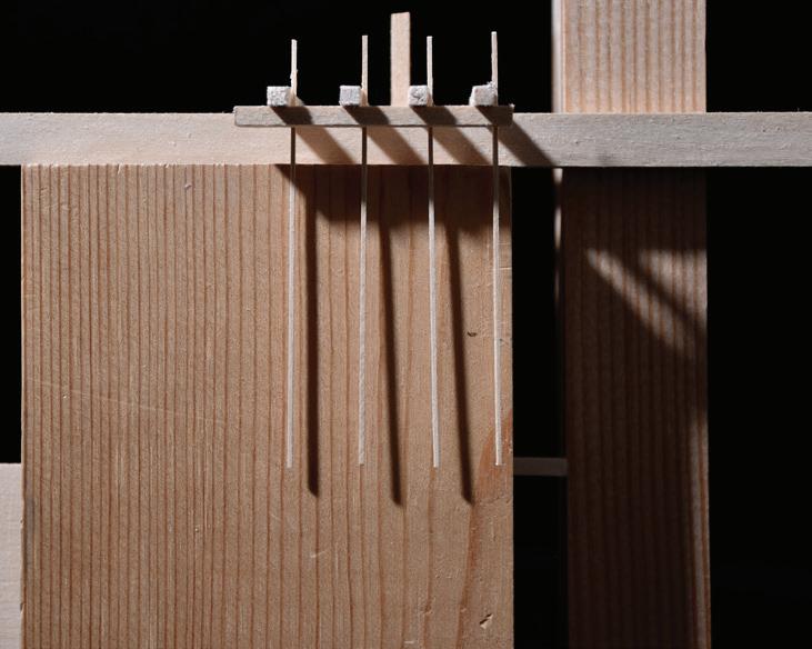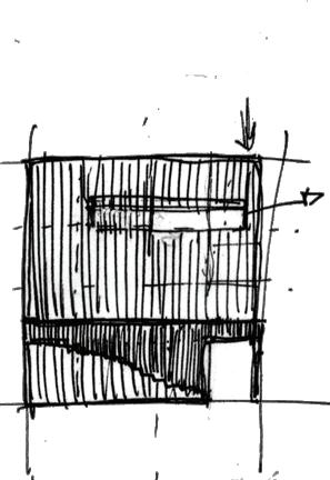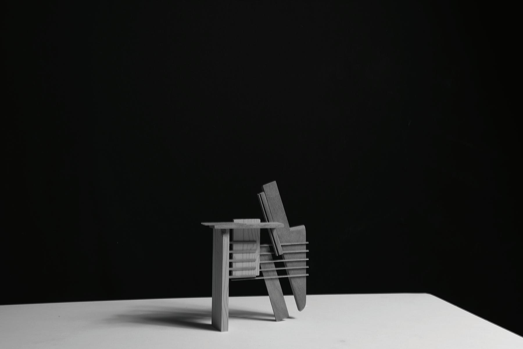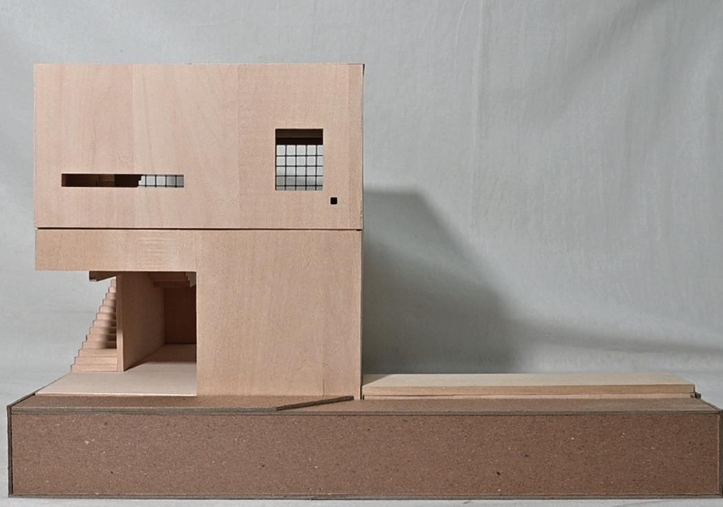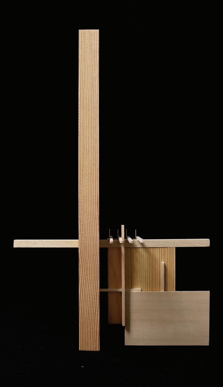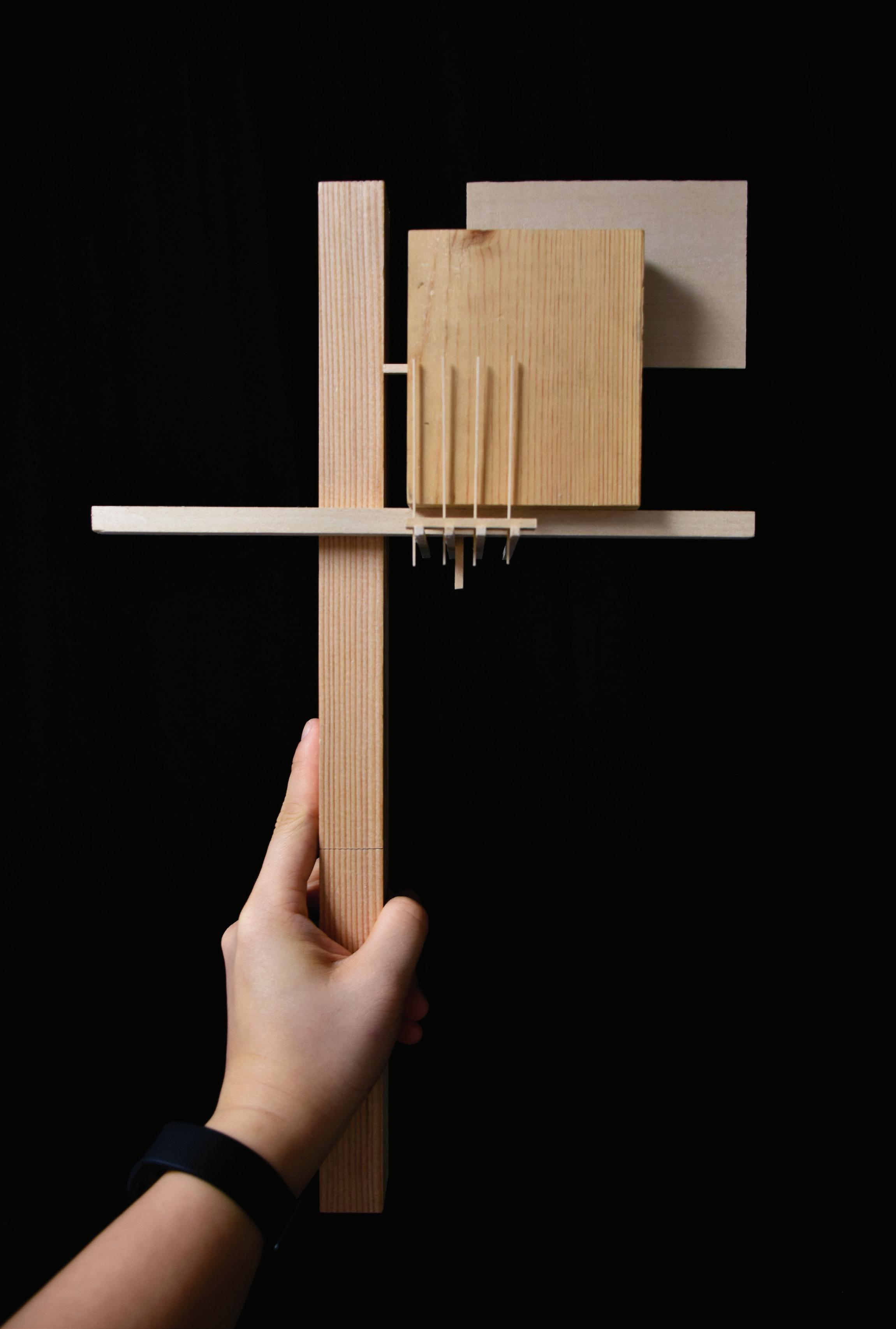 Parti sketch (left), 3D printed wood and wood veneerl model (right)