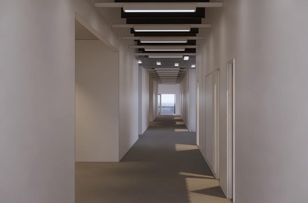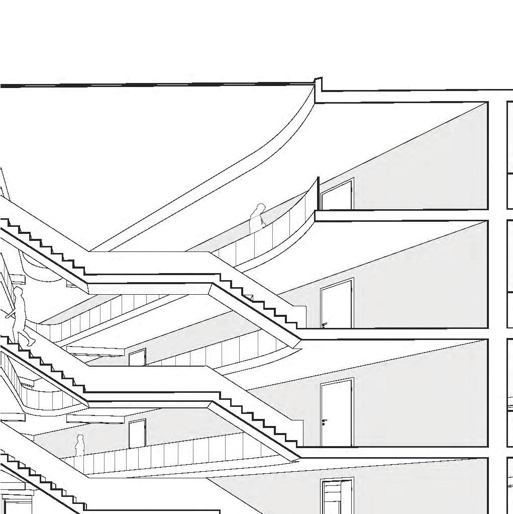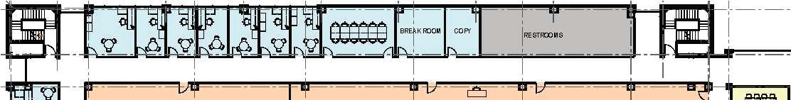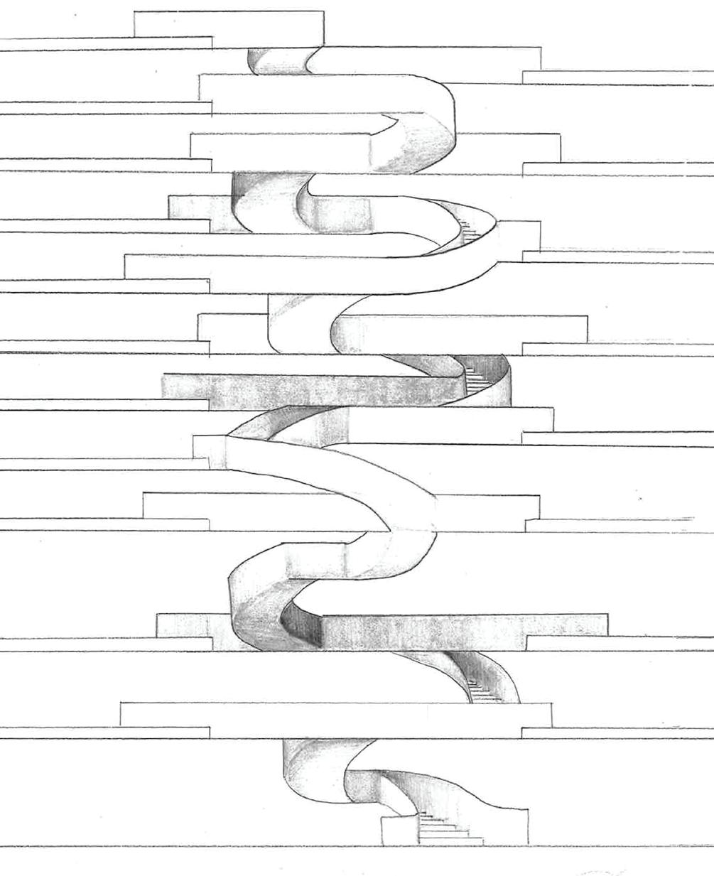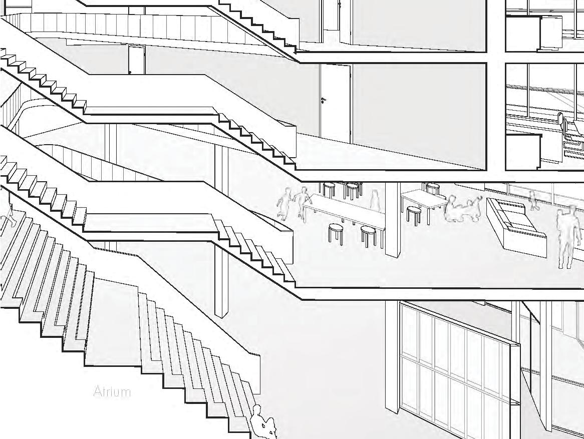 A band of 10.5’ wide labs are located on the north while conference rooms and offices are located in the south. The spiraling stair forms a web of connections to each corresponding floor.