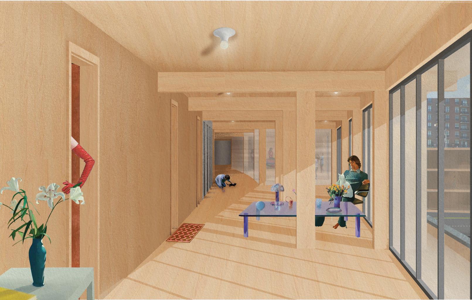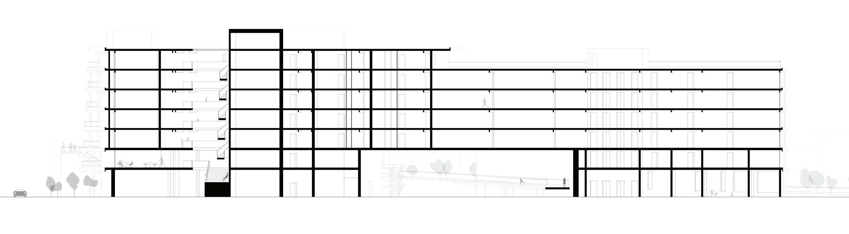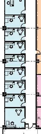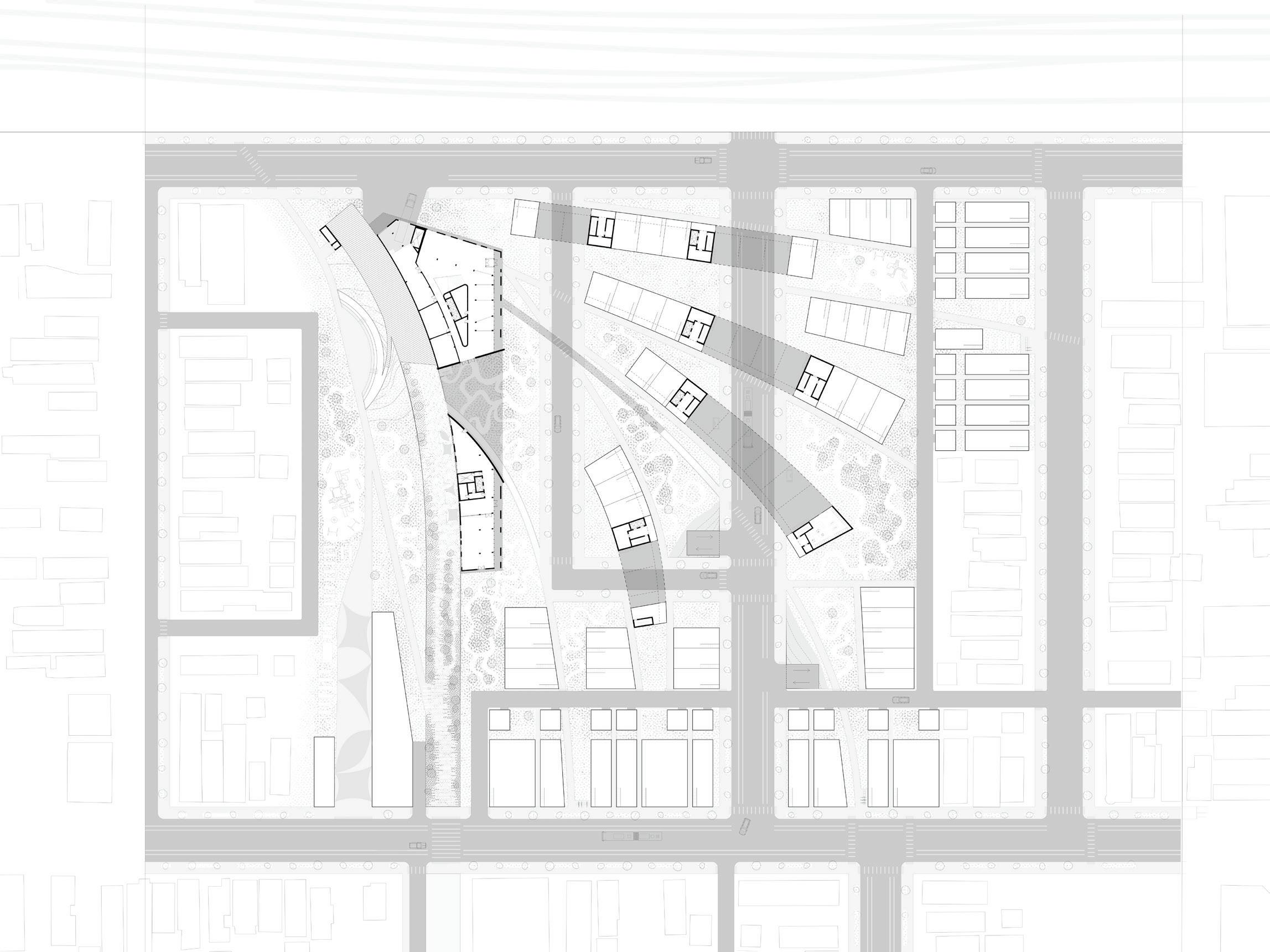 A band of 10.5’ wide labs are located on the north while conference rooms and offices are located in the south. The spiraling stair forms a web of connections to each corresponding floor.