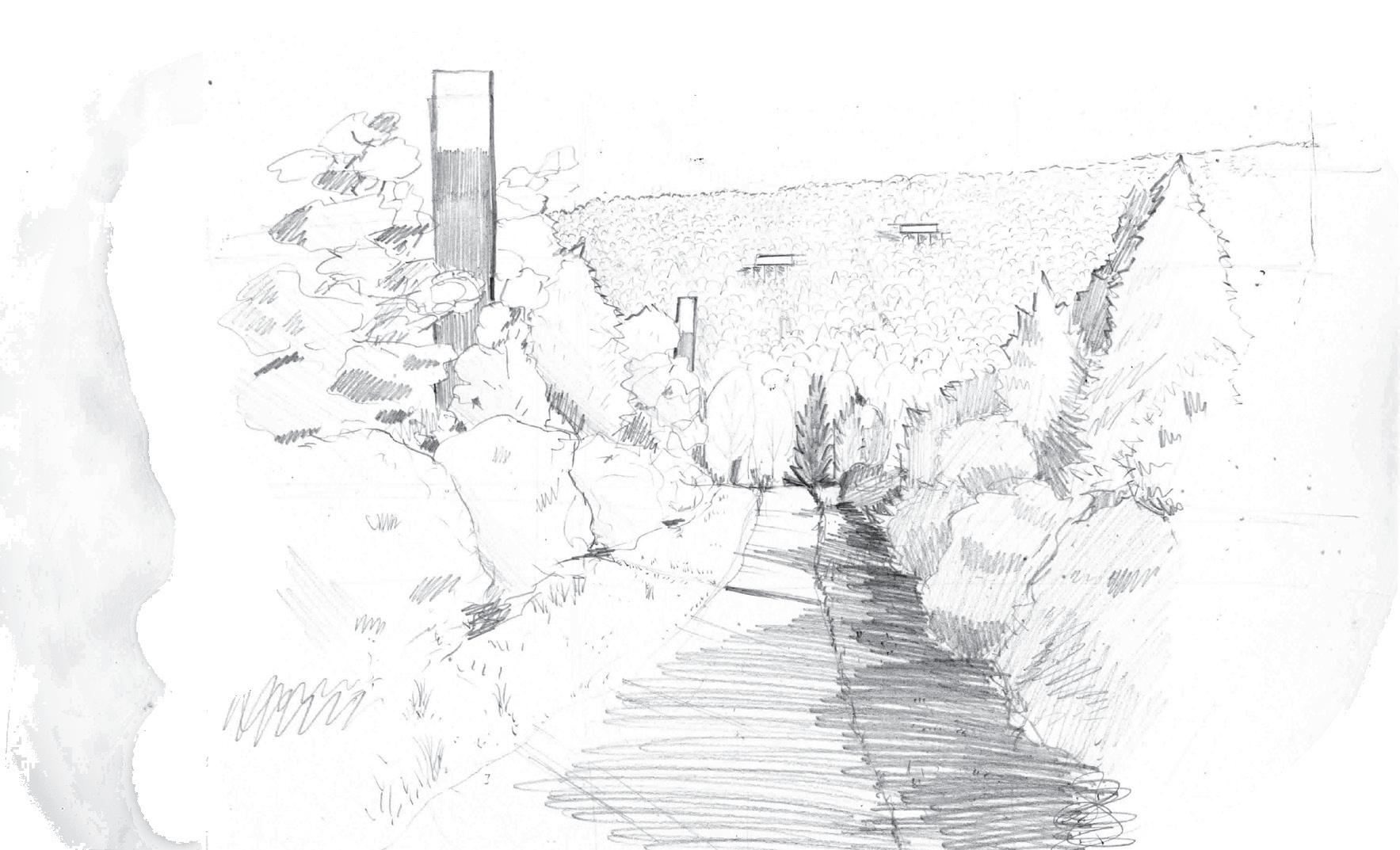 Located at the lowest elevation of a valley, the creek invites one to gaze downward and bathe in it. To understand that steam and valley correspond. With every step leading up to the flowing stream of water, a path of stone and wood then metal and wood bring attention to hearing. At the end of the platform the visitor hears the creek more clearly and loudly than before.