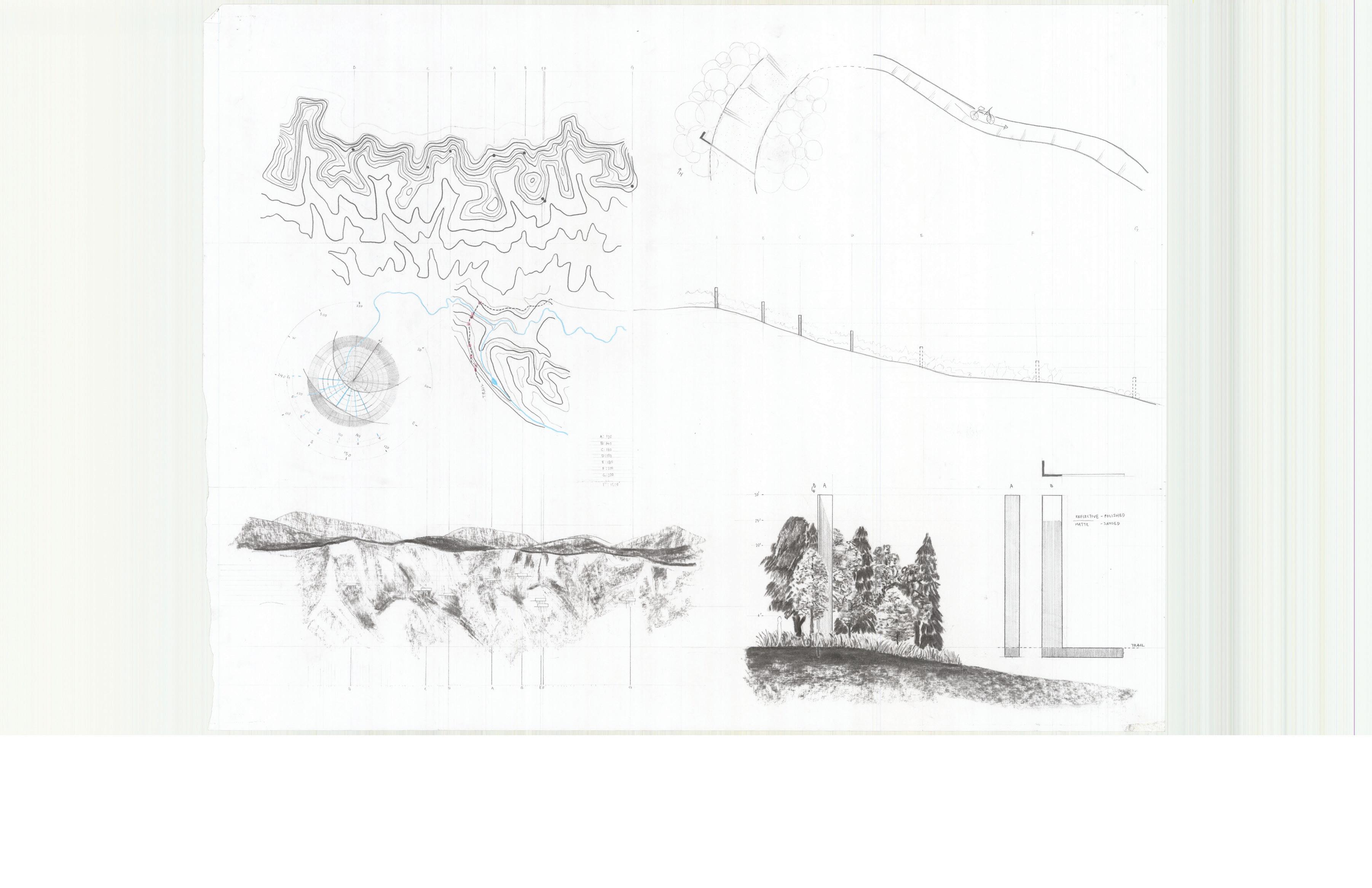 Located on facing sides of a valley, the ‘elevation post’ and ‘elevation marker’ explores how man measures landscape and experiences the slope, to understand what it means to travel down a slope at our body’s pace and the scale of the moutains. Each pair of structures denote two points in space at the same elevation. The ‘post’ and ‘marker’ are visually connected by the sun, revealing an overlooked relationship as the weather changes.