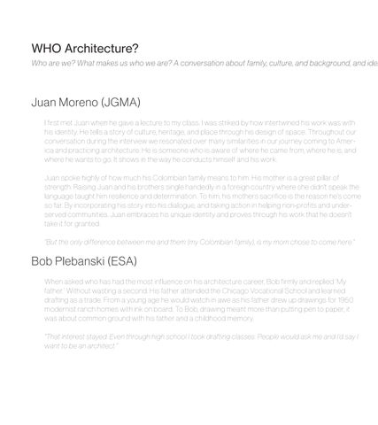 I first met Juan when he gave a lecture to my class. I was striked by how intertwined his work was with his identity. He tells a story of culture, heritage, and place through his design of space. Throughout our conversation during the interview we resonated over many similarities in our journey coming to America and practicing architecture. He is someone who is aware of where he came from, where he is, and where he wants to go. It shows in the way he conducts himself and his work.