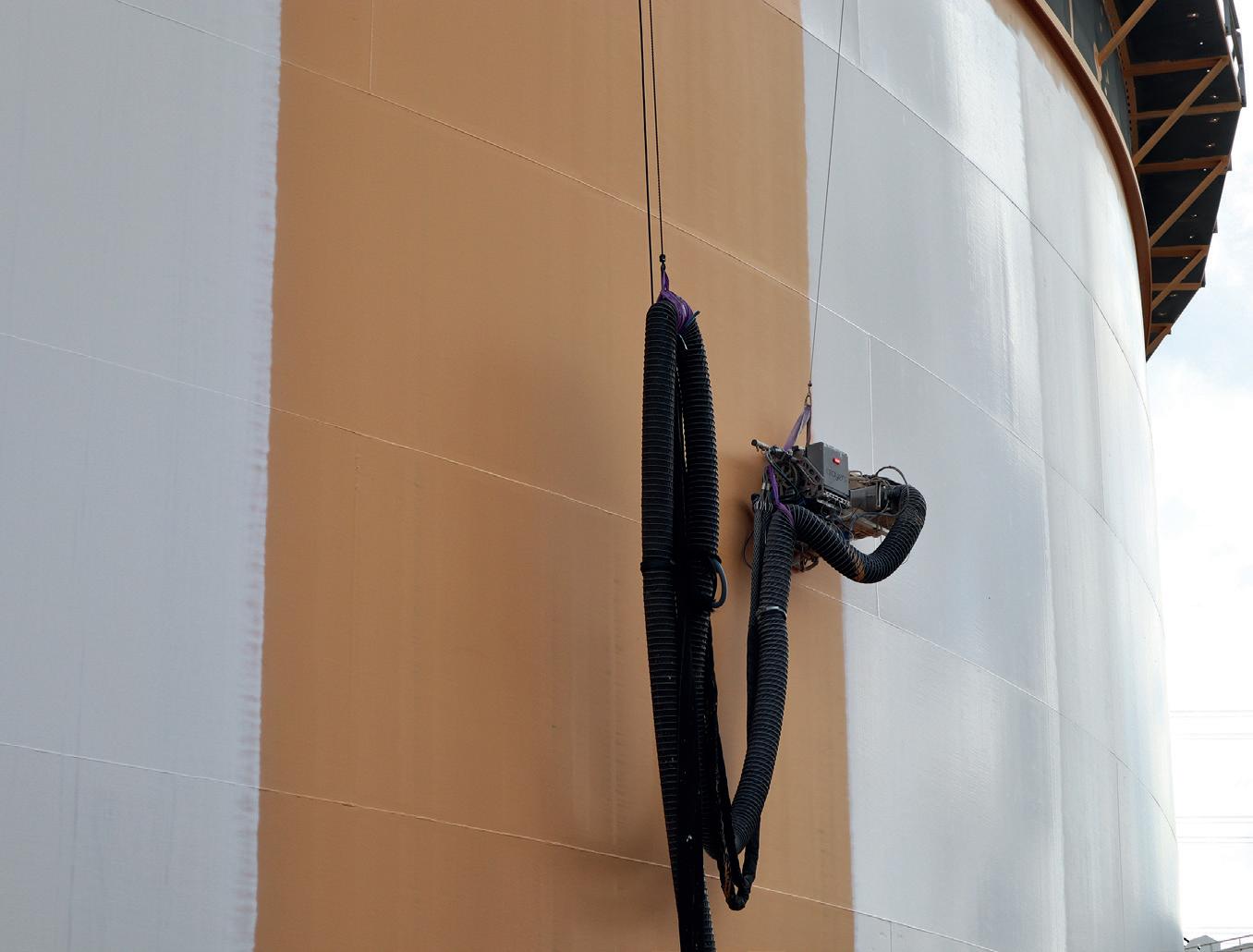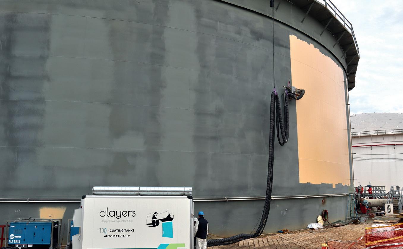 Technology is increasingly being used and developed in the industry, to make various processes safer and more reliable. ‘At the moment, storage tanks are painted manually; usually referred to as coating. They are painted with rollers in the same way we paint our bedroom walls,’ says Groot. ‘In some cases, a spray gun is used but a lot of countries are against this due to its negative impact on people and the environment. Many are reverting to timeinefficient rolling processes. As a result, individuals painting work from dangerous heights, which can potentially lead to harmful accidents.’ In shedding light on the current manual processes of coating tank exteriors, Groot emphasises how the gap in the market for the 10Q came about – and how there was also a desperate need for the technology to be innovated. Groot says: ‘With the 10Q robot, the current paint application process is outdone [whereby its efficiency, waste reduction and safety measurements are all improvements on manual paint processes]. The robot uses magnets to climb along the tank wall and surface. This is the only commercially available solution for automated paint application on storage tanks.’ Qlayers’ robot provides an automated solution that not only reduces risk to people, but also reduces time spent painting, waste paint and the impact on the environment. ‘With manual processes, there is always the opportunity for risks, and up to 50% of paint is wasted,’ adds Groot. The 10Q robot is especially innovative as it also tackles the recurring process of painting a tank. ‘Tanks need to be painted every 15-20 years. In a manual process, the contractor comes in and removes the coating and then applies more coating layers. Businesses offering this service often also specialise in scaffolding to achieve this,’ says Groot. However, with