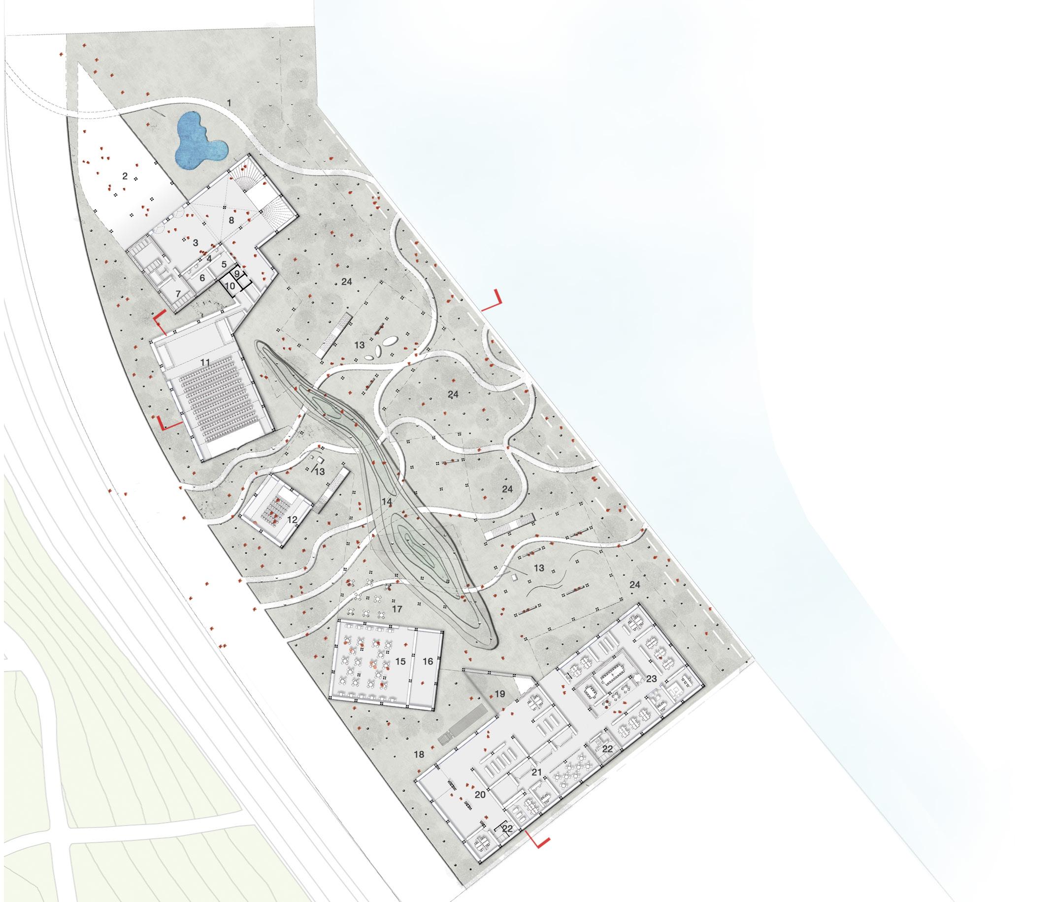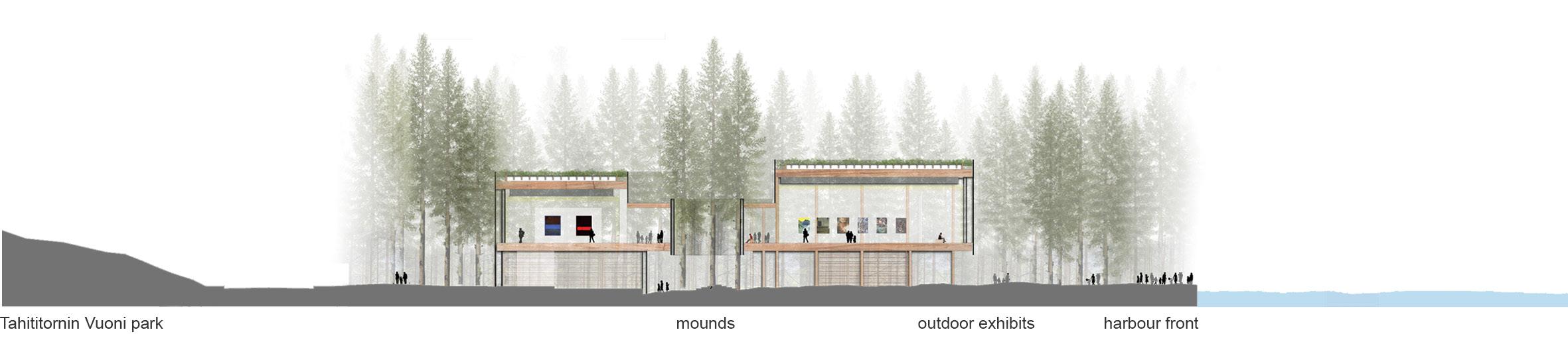 The program of the museum is broadly divided into two levels.The event and public spaces forms the lower level of the museum which anchors the exhibit galleries on the upper level. The lower level also acts as a public/event space zone with areas such as a multi-function hall, classrooms/labs, outdoor exhibits and a cafetaria which form a crescent enveloping the forest space overlooking the harbour.
