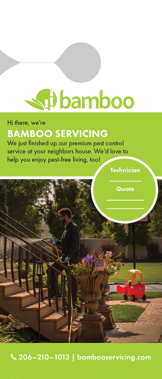 Front: We used the Bamboo Pest Control logo and color palette throughout the door hanger. He requested to have space for technicians to leave their name and a quote for their services. “Bamboo Servicing” leads the eye to the quote, followed by the contact information to request services.
