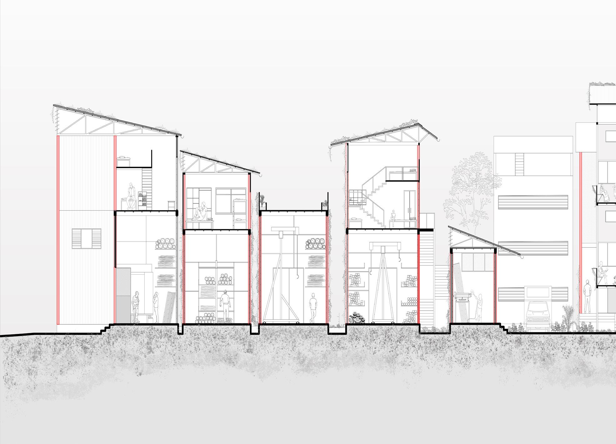 (L>R) Section through warehouses cuts through the rear, and mainly through the re-imagined housing for dwellers on the edge of the bunder