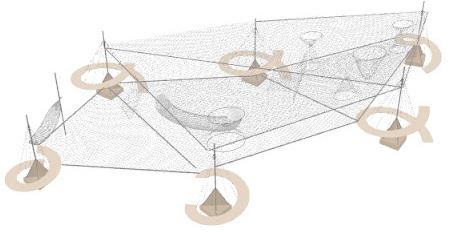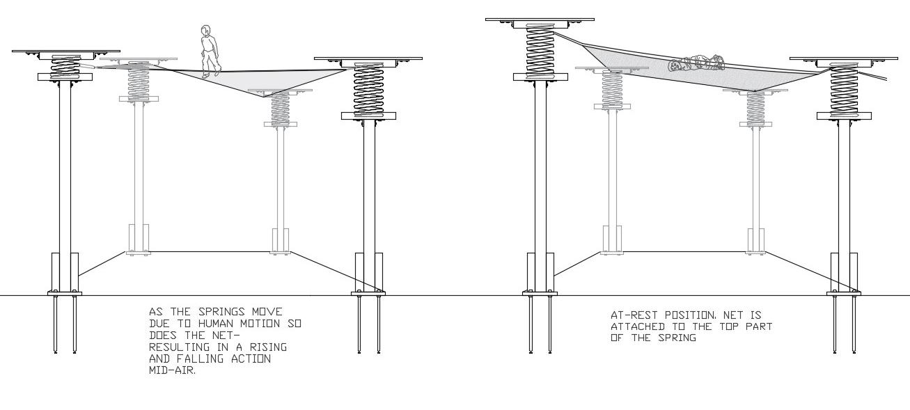 The nets are composed such that they provide gradation of intimate spaces by facilitating tunnels as alternative of circulations, warps with holes to move from one space to another and also a central slide to add the tinge of playfulness. The overall idea was Elevating normalised experience by simply shifting the perspective as in this case the garden is experienced from a higher level also considering its sensorium interacting with the sky and the ground.