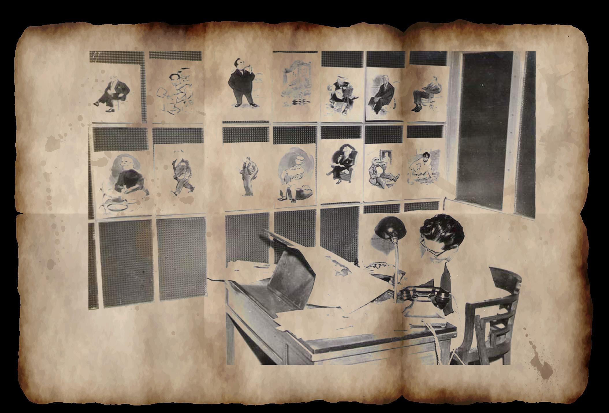 A picture of R.K Laxman working on cartoons sitting in his workplace