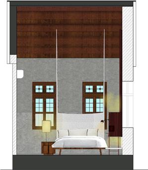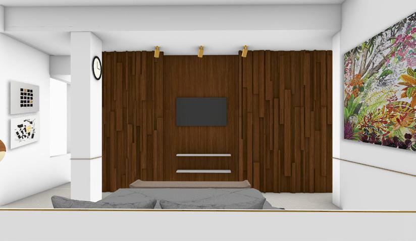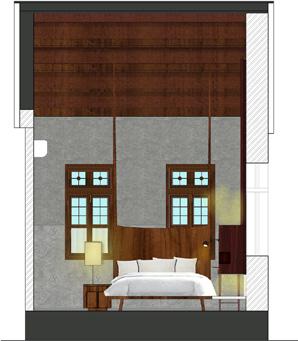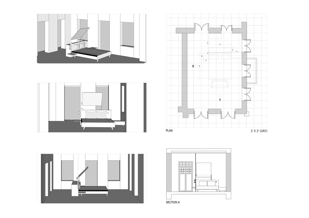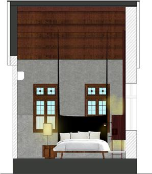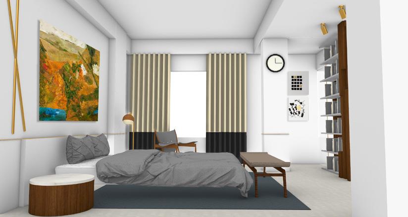 A number of iterations were made to see the material and colour of the bed back, side table and lamp.