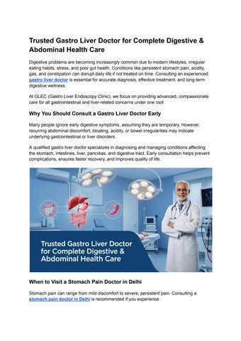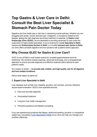 GLEC (Gastro Liver Endoscopy Clinic) by Dr. Ankita Gupta, a Gold Medalist and one of the best gastroenterologists in Delhi, is a trusted gastro and liver clinic located in Greater Kailash, South Delhi. Our clinic specializes in advanced diagnosis and treatment of digestive, liver, and stomach disorders, using state-of-the-art endoscopy technology and a patient-centric approach. At GLEC, we are committed to delivering accurate medical care with compassion and expertise. From managing acidity, constipation, liver disease, and abdominal pain to offering specialized gastro and liver treatments, we provide complete care for your digestive health. If you’re looking for a gastro liver hospital in Delhi, a reliable gastro liver doctor near you, or a top-rated gastro and liver clinic in South Delhi, GLEC is your trusted destination for comprehensive gastroenterology and hepatology care. call now-(+91)-8447663380