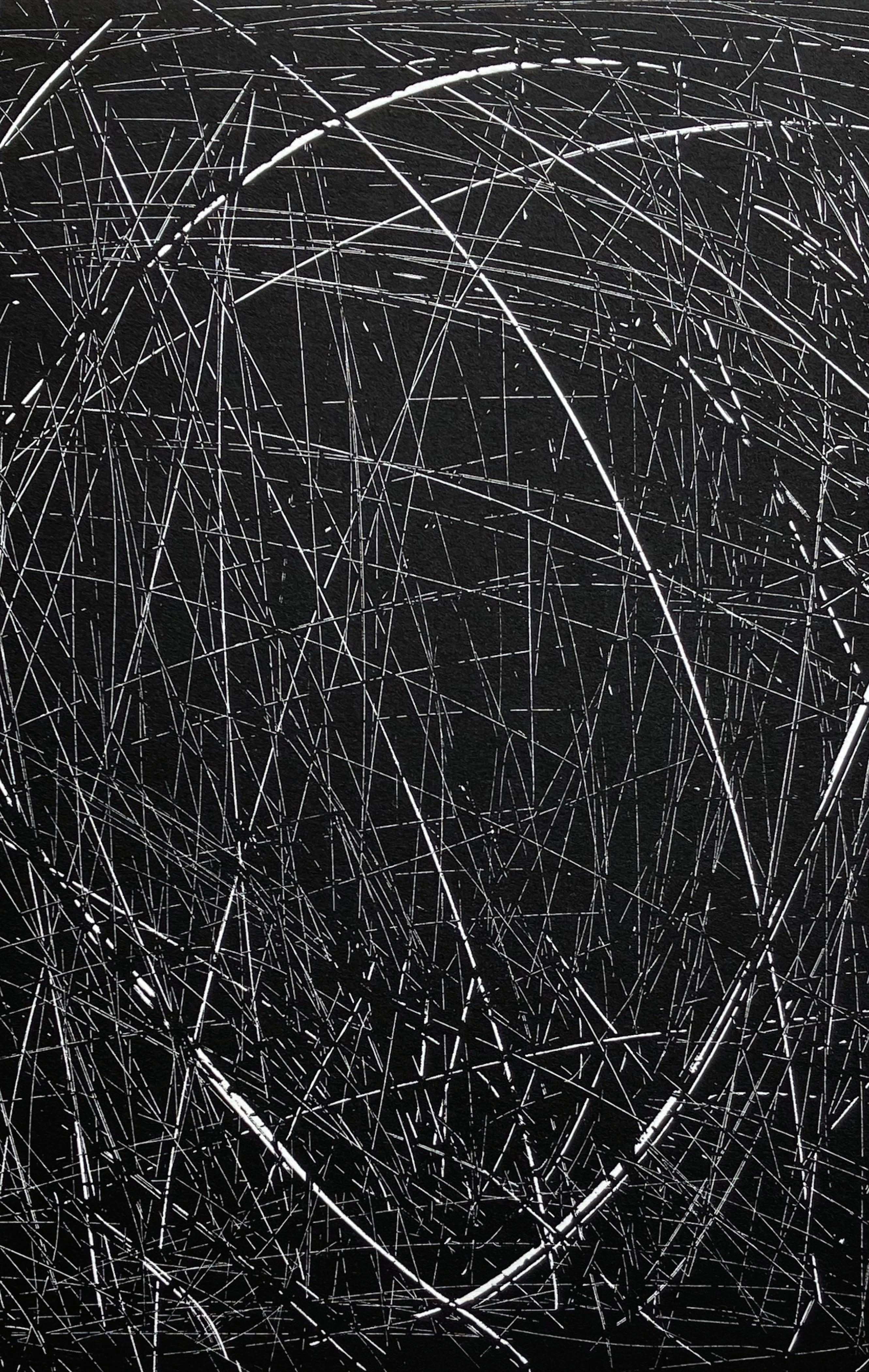 Light and line fascinate and challenge her. She spent years sailing with her husband, thus concentrating on water; the light on water; light and color in her monoprints; black and white drawing in graphite; light shining on the chrome of cars; dawning light dancing through leaves and cliffs driving up to Taos Ski Valley.