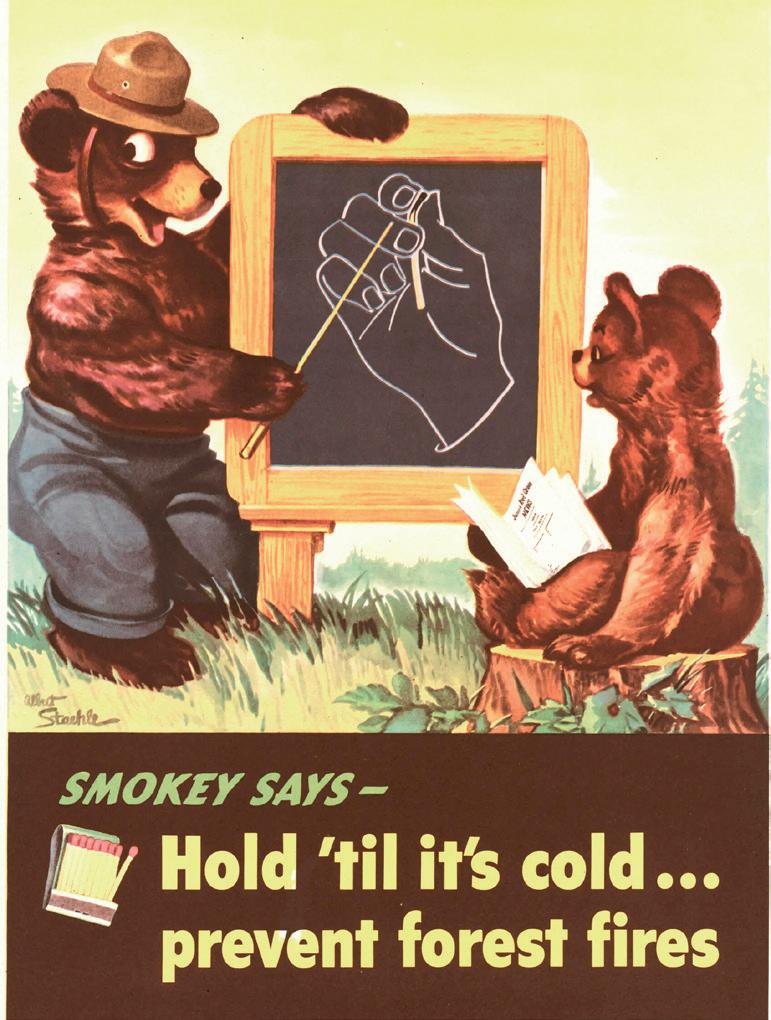 Smokey, whose campaign first began in 1944, unofficially became “Smokey the Bear” in a 1951 hit song. Songwriters Steve Nelson and Jack Rollins added “the” to fit the lyric. The icon of the cartoon bear that told generations of Americans to douse campfires, because “Only YOU can prevent forest fires,” took on flesh and blood during a fire in New Mexico’s Lincoln National Forest in 1950 when crews fighting a wildfire in Capitan Gap found a badly burned American black bear cub.