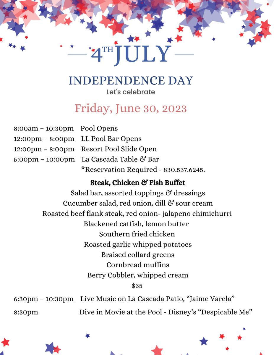 CONTENTS 3: June Highlights 4: New Members 5-8: 4th of July Weekend 9-18: July Events 19: Upcoming Golf Events 20: Dive In Movie Schedule 21 - 22: Summer Activities 23: Pool Party Packages 3 Member Events 24 -26 La Cascada Table & Bar Live music schedule, Member specials and more 27-28 Upcoming Events 29 Contact Us 27-28 Upcoming Events Check out upcoming July events 25-26 LA CASCADA TABLE & BAR View the live music schedule and Member specials