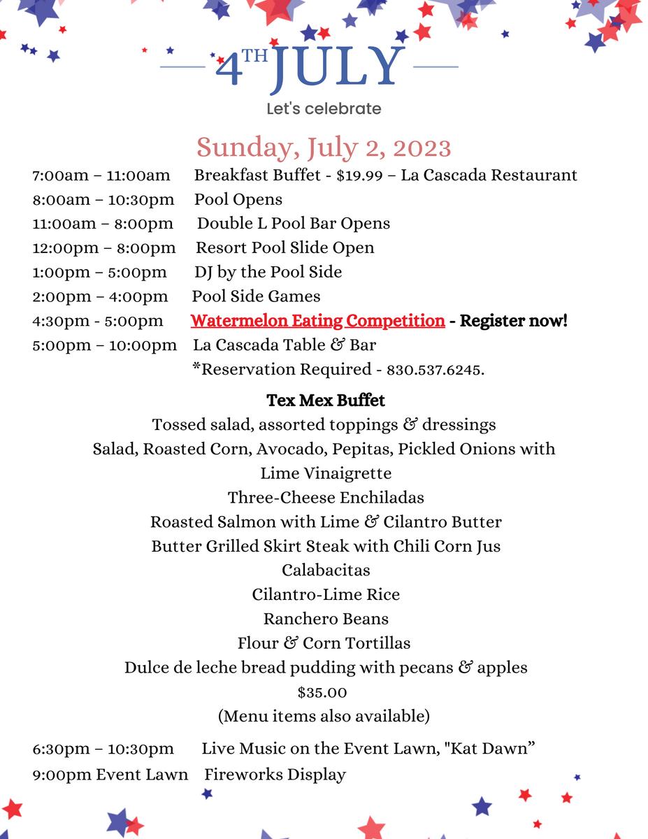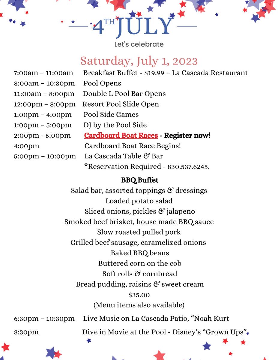 CONTENTS 3: June Highlights 4: New Members 5-8: 4th of July Weekend 9-18: July Events 19: Upcoming Golf Events 20: Dive In Movie Schedule 21 - 22: Summer Activities 23: Pool Party Packages 3 Member Events 24 -26 La Cascada Table & Bar Live music schedule, Member specials and more 27-28 Upcoming Events 29 Contact Us 27-28 Upcoming Events Check out upcoming July events 25-26 LA CASCADA TABLE & BAR View the live music schedule and Member specials