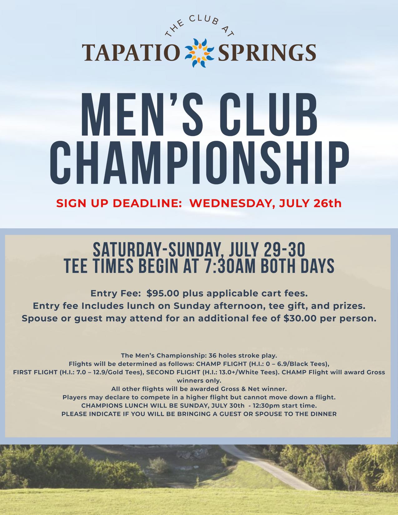 July 29-30th: Men’s Club Championship 7:30AM Tee Times