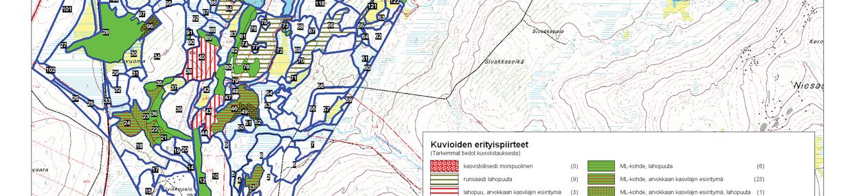 kuvioKluontotyyppiluonnon- tilaisuus puusto, lajitpuusto, pituus erityistä, lajistoerityistä, muut kuvaus 968 kVkR 2mä 5 räme 969 kK g R2 mä , ku , ko10 kuiva räme 970 kK g R2 mä , ku , ko10 kuiva räme 971 kEMT 2mä , ku , ko10 kan g asmetsä 972 kHMT 2ku , mä , ko15 kan g asmetsä 973 kK g K2 ku , ko10 karukor p i 974 kavoin p ainanne2avoin p ainanne 975 kEMT 2mä , ku , ko10 kan g asmetsä 976 kteollisuus 1 Aavahelukan lentokenttä 978 kEMT 2mä , ku , ko10 kan g asmetsä 979 kVKR/VSN 3mä , ku , ko10 kor p , avoin neva 980 kA 1 hakkuuaukea 981 kRhK/PaLu 3ku, mä , ko10 ruohoinen kor p i 982 kA 1 hakkuuaukea 983 lähteikkö/K/HMT3 ku, ko, mä15 ML-kohde (lähde) laaja-alainen lähteikkö, jyrkkäreunainen laakso, jossa korpea, ympärillä lahopuustoista kan g asmetsää 984 kA 1 hakkuuaukea 985 kPaLu/SRhLu/K3 ku, ko ML-kohde ( rantaluhta ) Kuer oen varsi 986 ClT 1 mä5 kan g asmetsä , osittain hakattu p uusto 987 HMT3 ku , mä , ko15 laho p uuta kan g asmetsä , hakkuilta sääst y n ty p ieni kaistale 988 OlVSN3puron varren avosuo, länsireuna saravaltainen, itäreuna vaivaiskoivuvaltainen, vanhaa niittoaluetta, pieni kaistale vanhempaa metsää 989 kMCClT 2mä , ku , ko10 kan g asmetsä 990 kK g R2 mä , ku , ko10 kuiva räme 991 EMT2 mä , ku , ko10 kan g asmetsä 992 kVSN 3avosuo 993 kK 3ku, ko , mä10 ML-kohde ( p uro ) p uronvarsikor p i 994 kHMT 2ku , ko , mä10 kan g asmetsä 995 kVkR/lähde 3mä ML-kohde ( lähde ) räme , lähdesuo 996 kA 1 siemenpuuasentoinen hakkuuaukea 997 ClT2 mä5-10 karukkokan g as , olisi kauttaaltaan j äkälän p eitossa 997 kHMT 2ku , mä , ko10 kan g asmetsä 998 OlS p hRiN3avoin rim p ineva 999 EMT2 mä , ku 10-15 kan g asmetsä , o j itetulta alueelta kuusivaltaista 1000 kK g Rm1 mä o j itettu kuiva räme 1001 kTRm 1mä 5 o j itettu räme 1002 OlSR3 mä5 kelo j a y hdistelmät y y p in saraneva 1003 kVIRm 1mä o j itettu räme 1004 VkR3 mä5 räme , p uronvarresta kor p imaisem p 1005 LuVkR3 ku , mä , ko5-15 luhtainen räme 1006 OlVSN 3ML-kohde ( lähde ) avoin , suursarainen neva 1007 VkR/EMT3 mä saareke suolla 1008 MeVSN/LuN3 ku , ko , mä3-7lähdehetekaali ML-kohde ( lähde , p uro ) p uronvarren kostea kuvio , p ieni lähde laskee p uroon 1009 VkR3 mä, ku, ko5-10 räme, pieniä nevapinto j a, kuvion läpi virtaa puro 1010 OlLkR/VkR/PaLu3 mä p uronvarsi , hienostimendelöiväluonnontilainen p uro 1011 MK g K3 ku , ko5-20 p ienen p uronvarren kor p i kuivien kankaiden välissä 1012 LuOlVSN3luhtainen avosuo 1013 PsR2 mä5 keskeltä hieman märem p räme 1014 kK g R2 mä , ku , ko10 kuiva räme 1015 T1 mä1-3 taimikko 1016 VIR/VkR3 mä , ku , ko3-5 räme 1017 OlLkR3 mä1-3 y hdistelmät y y p in räme , p ieniä nevaosia 1018 OlLkR3 mä y hdistelmät y y p in p uustoinen neva 1019 OlRuRiN/OlS p hRiN3 ( mä ) 3 p aikoin ruo p p arim p inen neva 1020 EMT2 mä15 kan g asmetsä 1021 OlVSN/OlRiNR 3mä, ko 2 ML-kohde ( lähde ) p aikoin avoin y hdistelmät y y p in neva, leväkkörim p iä, mättäät rahkarämettä