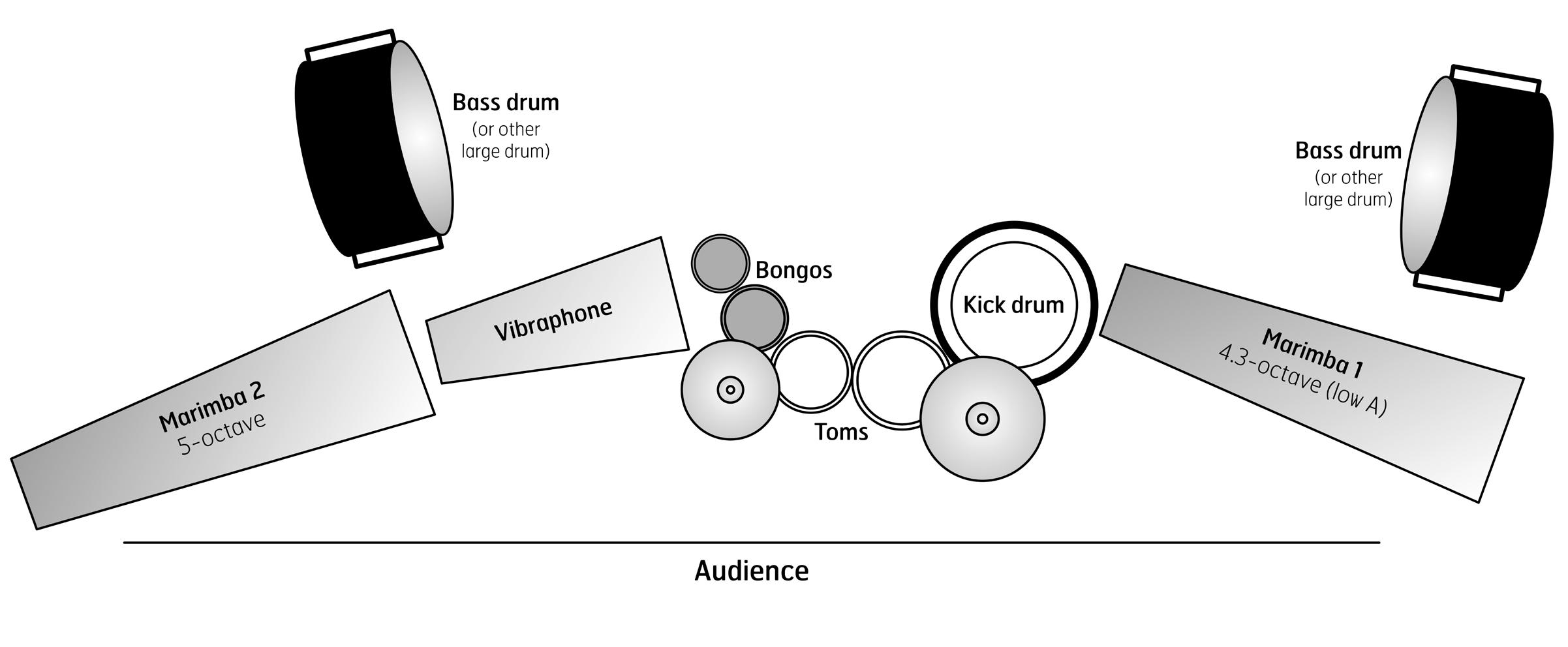 4. Percussion — kick drum (mounted) , 2 toms (high & low), bongos, 2 suspended cymbals (high & low)