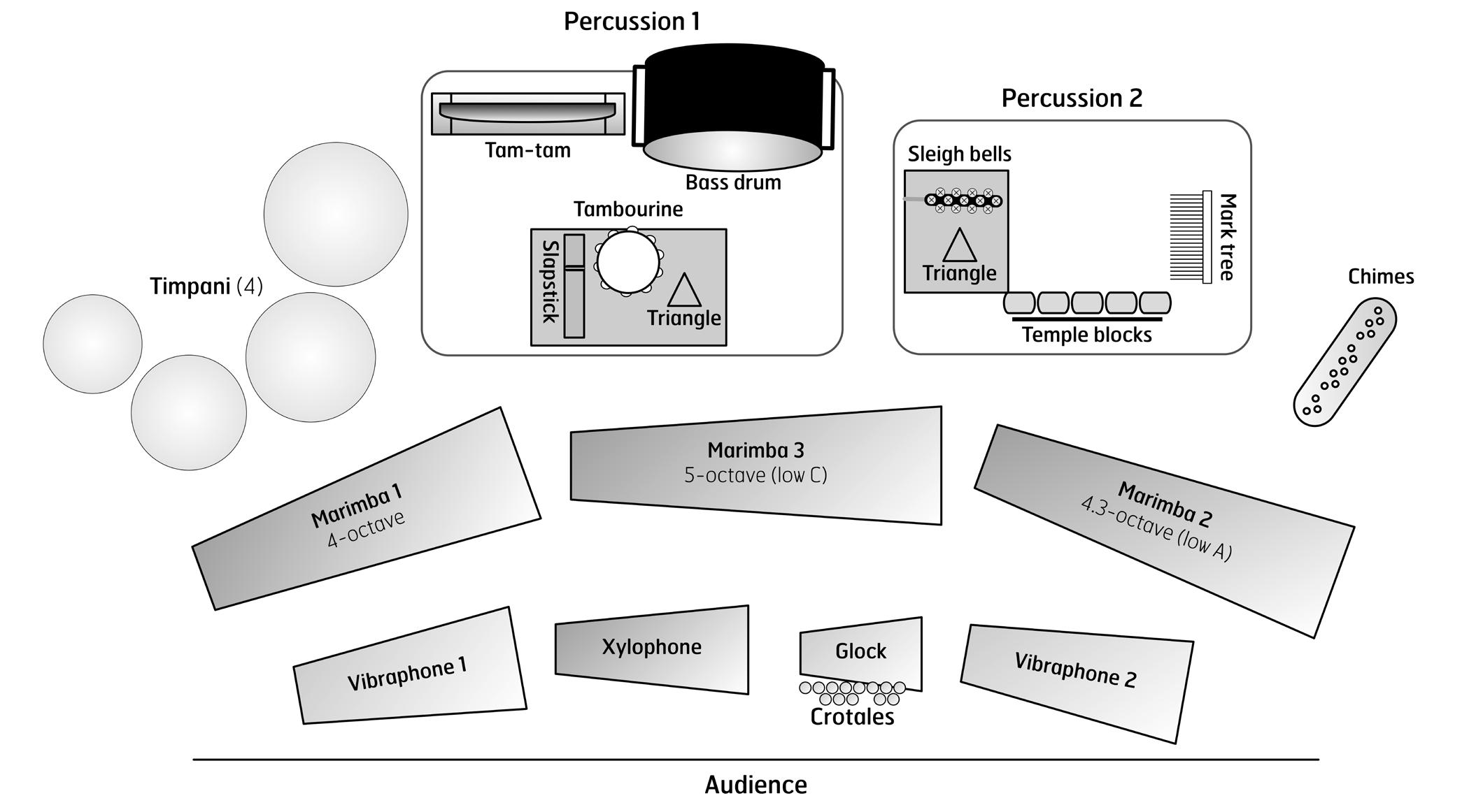 • Percussion 2: Use a 9" triangle (or larger than percussion 1). For the mark tree, a double row would work, but experimenting with an echo tree or dream tree may provide a colorful addition to the soundscape.