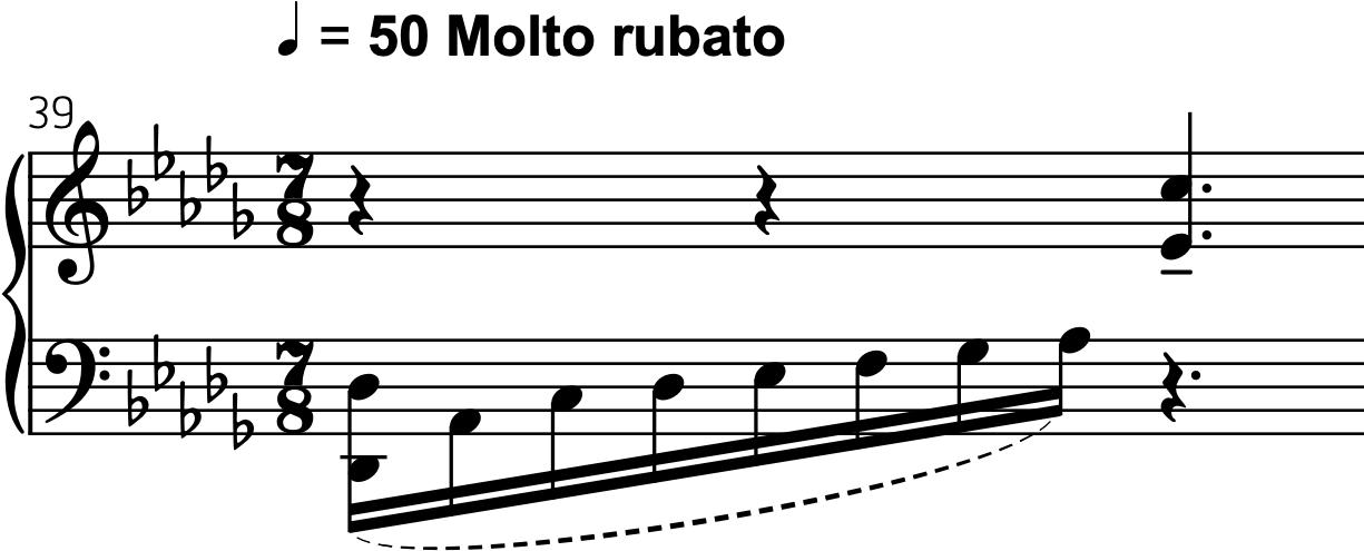 This piece makes use of a dotted slur (pictured below) to indicate an accelerando and ritardando within the same figure. The tempo should speed up and slow down back to the original tempo. It’s up to the performer how much to speed up by and exactly when to change from accel. to rit. (And not all dotted slurs have to be the same.)
