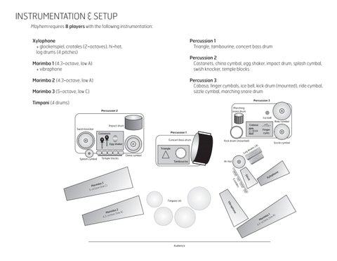 INSTRUMENTATION & SETUP Mayhem requires 8 players with the following instrumentation: Xylophone + glockenspiel, crotales (2-octaves), hi-hat, log drums (4 pitches) Marimba 1 (4.3-octave, low A) + vibraphone Marimba 2 (4.3-octave, low A) Marimba 3 (5-octave, low C) Timpani (4 drums)