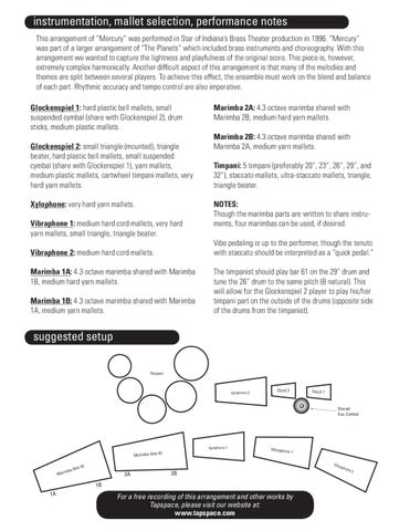 instrumentation, mallet selection, performance notes This arrangement of “Mercury” was performed in Star of Indiana’s Brass Theater production in 1996. “Mercury” was part of a larger arrangement of “The Planets” which included brass instruments and choreography. With this arrangement we wanted to capture the lightness and playfulness of the original score. This piece is, however, extremely complex harmonically. Another difficult aspect of this arrangement is that many of the melodies and themes are split between several players. To achieve this effect, the ensemble must work on the blend and balance of each part. Rhythmic accuracy and tempo control are also imperative. Glockenspiel 1: hard plastic bell mallets, small suspended cymbal (share with Glockenspiel 2), drum sticks, medium plastic mallets. Glockenspiel 2: small triangle (mounted), triangle beater, hard plastic bell mallets, small suspended cymbal (share with Glockenspiel 1), yarn mallets, medium plastic mallets, cartwheel timpani mallets, very hard yarn mallets. Xylophone: very hard yarn mallets. Vibraphone 1: medium hard cord mallets, very hard yarn mallets, small triangle, triangle beater. Vibraphone 2: medium hard cord mallets. Marimba 1A: 4.3 octave marimba shared with Marimba 1B, medium hard yarn mallets. Marimba 1B: 4.3 octave marimba shared with Marimba 1A, medium yarn mallets.