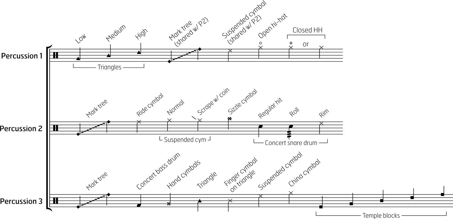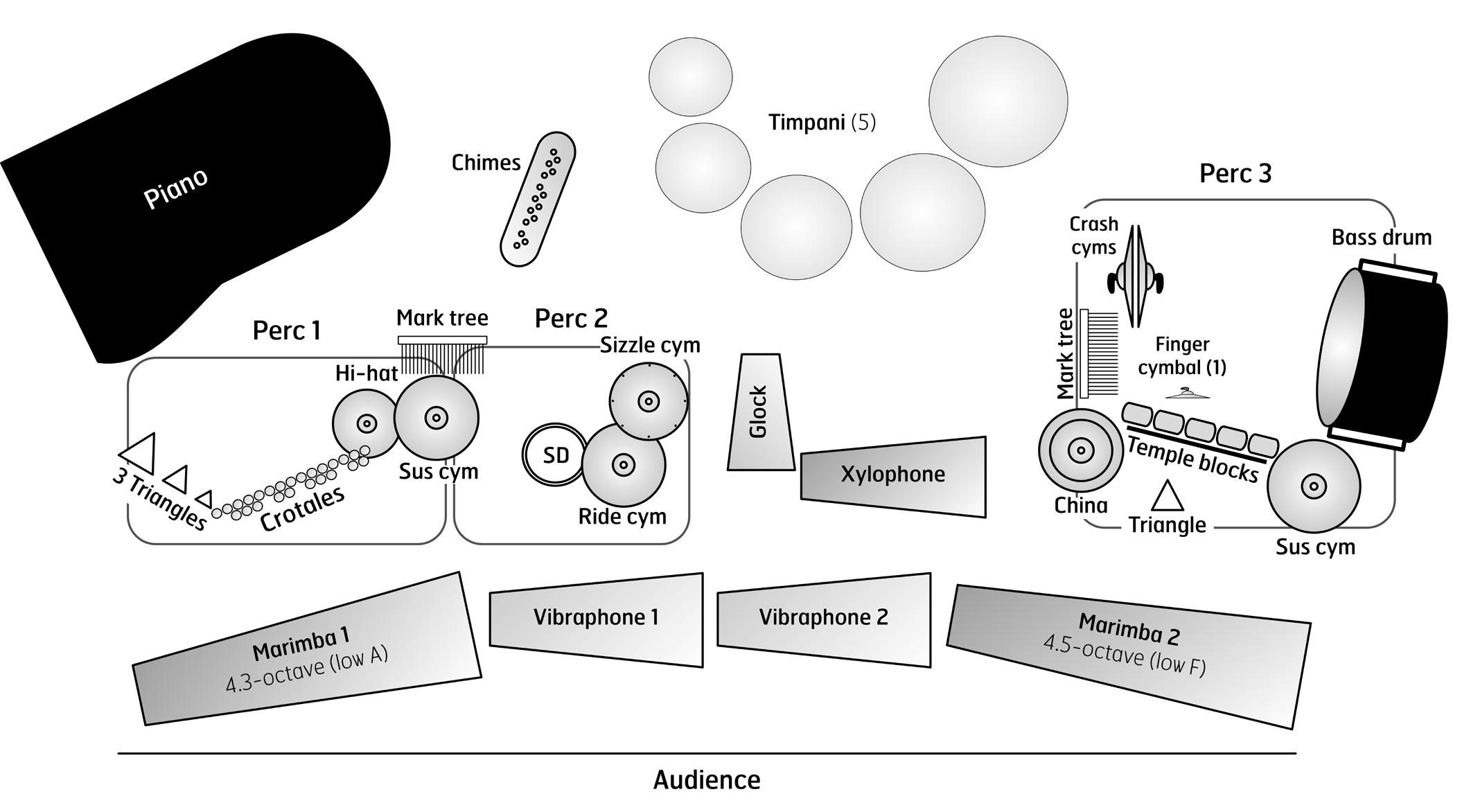 11. Percussion 3 — mark tree (or metallic wind chimes), suspended cymbal, finger cymbal (1), triangle, temple blocks (5), China cymbal, concert bass drum, hand cymbals