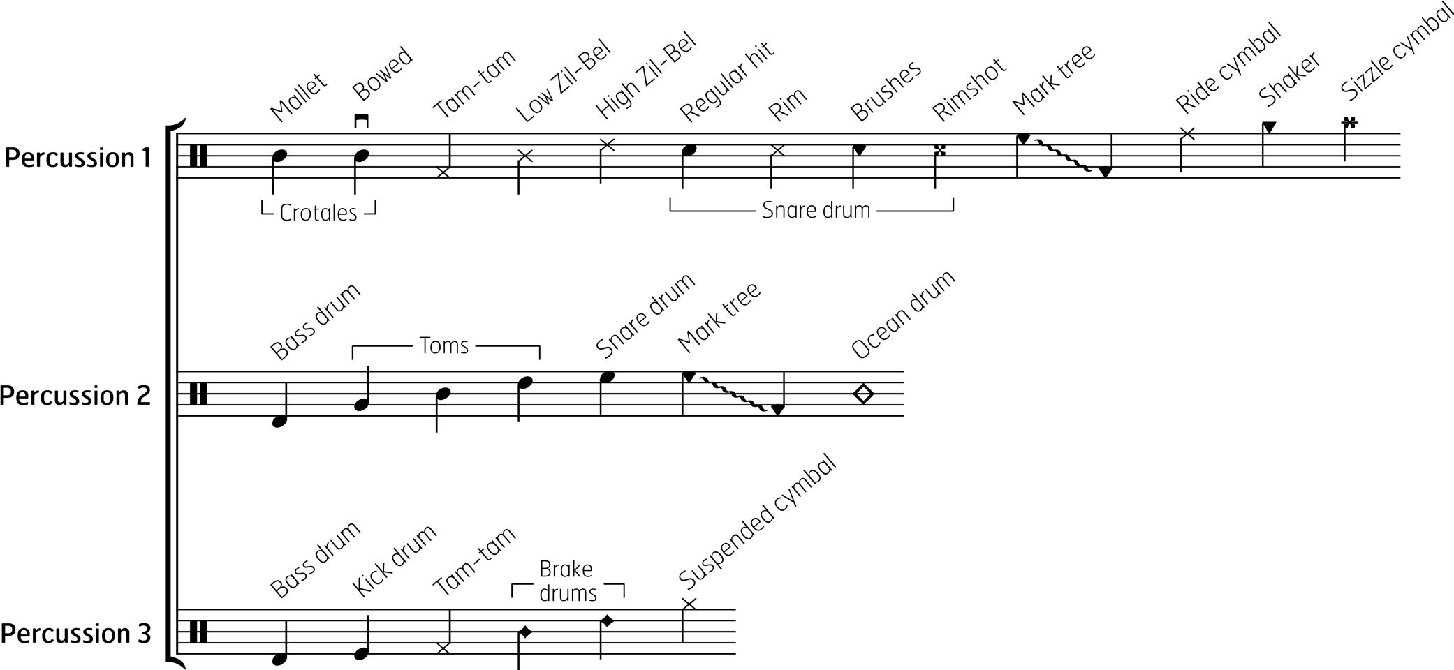 9. Percussion 3 — tam-tam, suspended cymbal, concert bass drum, mounted kick drum, 2 brake drums (also works with only one brake drum), bow