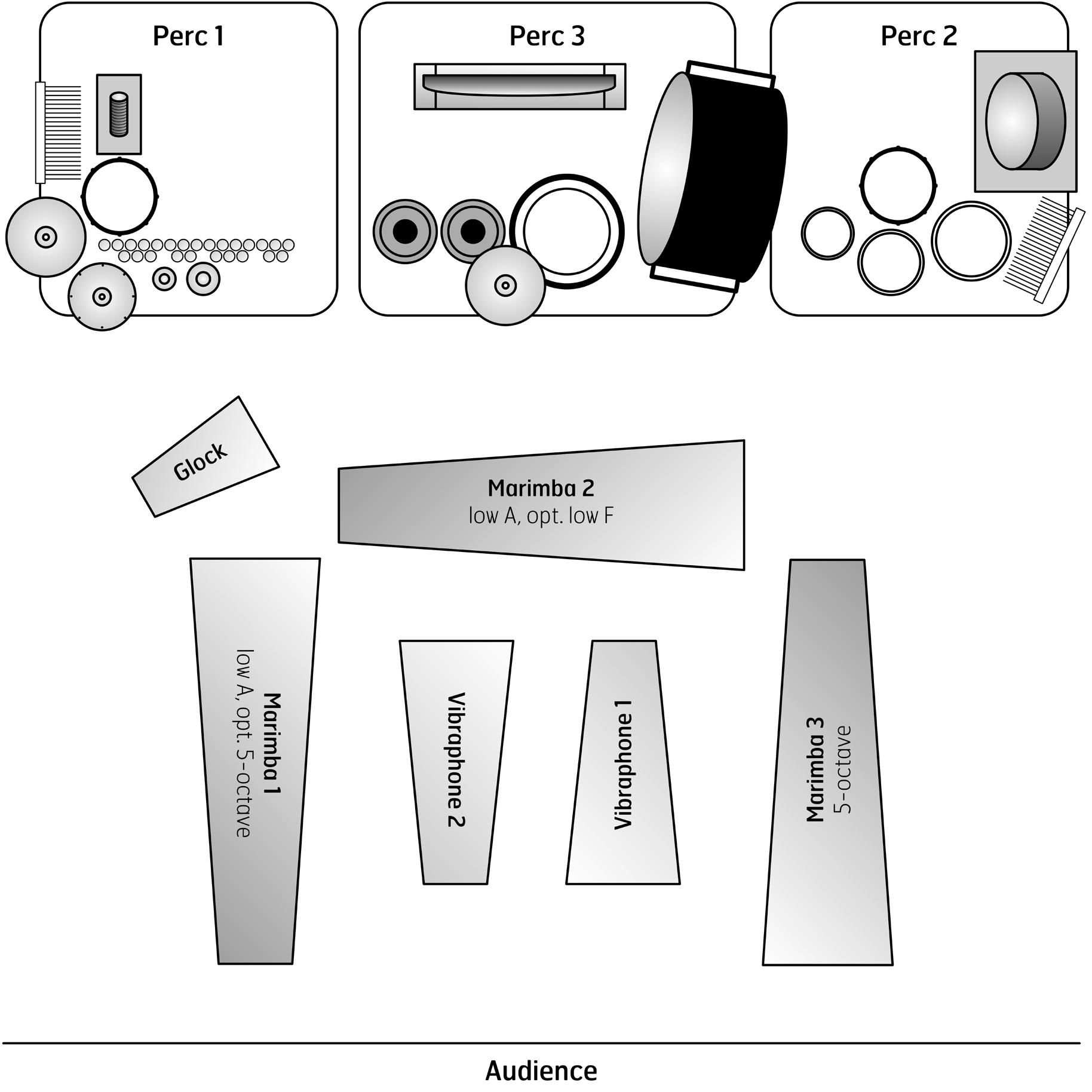 The glockenspiel part includes optional crotales notes. If a second set of crotales is not available, some of those notes may be played on the glockenspiel, and some may be played sharing the crotales in the Percussion 1 setup.