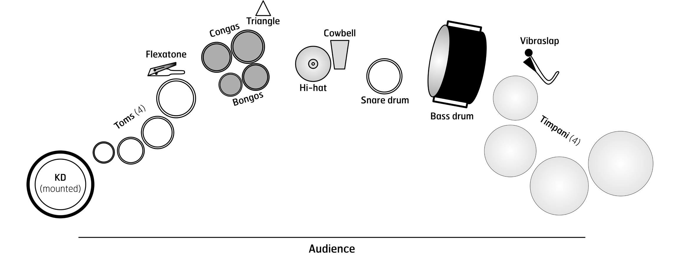 This piece is designed to be flexible in setup. It can be performed either in a traditional percussion ensemble configuration or from the back of a concert band setup, depending on your ensemble’s needs and available space.