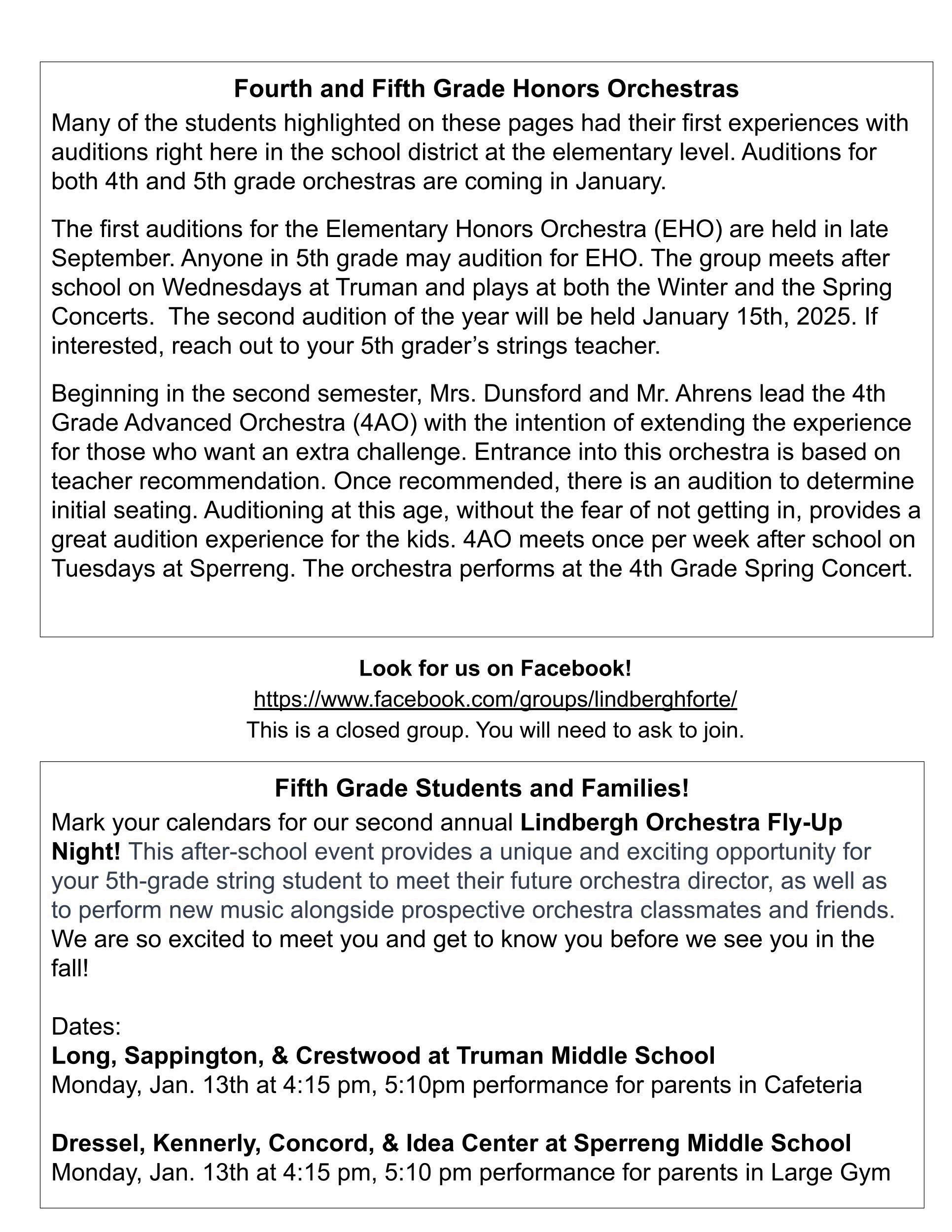 The Lindbergh Strings Staff encourages students to consider private lessons. A private instructor can advance individual technical development as well as promote individual musical growth and heighten self-esteem.