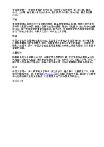 中国文学是一 博大精深的文学形式,其历史悠久,特点多样,发展前景广阔。如果 您对中国文学感 趣,不妨在HelpWriting.net上订购我们的文学作品,我们的专业作者 将为您提供高质量的文学作品,让您更深入地了解中国文学的魅力。