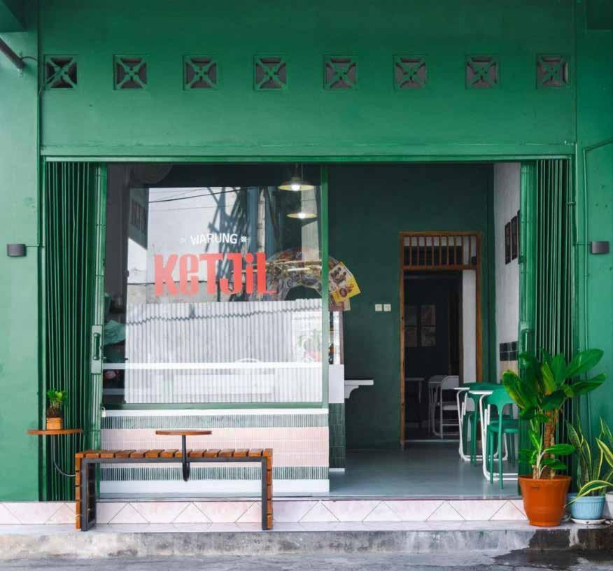 Interior view of Warung Ketjil with the concept of a modern restaurant and some application for visual asset needs such as logo signage and beverages product labels.