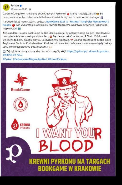 Podczas 3. Festiwalu i Targów Gier Planszowych BookGame 2025, po raz pierwszy w Krakowie ze wsparciem organizacji Krewni Pyrkonu oraz Regionalnego Centrum Krwiodawstwa i Krwiolecznictwa w Krakowie zorganizowana została akcja krwiodawstwa, w której udział wzięli uczestnicy BookGame i mieszkańcy Krakowa.