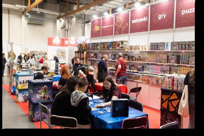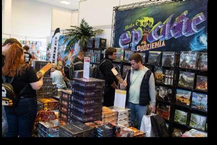 Strefa wystawców z grami planszowymi, książkami, komiksami, grami paragrafowymi, RPG, grami bitewnymi, puzzlami, klockami, akcesoriami do gier, kostkami Rubika i zabawkami kreatywnymi;