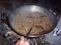 Se ponen las judias a remojo una noche. Al dia siguiente se ponen a cocer con sal y la oreja a trozos. Cuando las judías estén cocidas se fríen ajos a trozos pequeños, un poco de harina y pimienton, se echa un poco de agua a la sarten y se echa al puquero .Se deja cocer junto con el chorizo a rodajas después se echa arroz y se deja cocer. Se , puede dejar caldoso o seco.