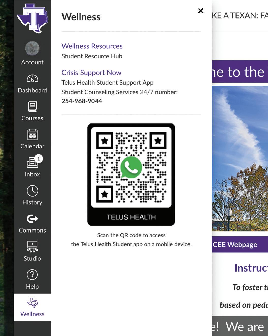 • The Wellness Button is a student-centered initiative integrated into Canvas to make health resources more accessible. This icon serves as a direct gateway to Tarleton’s Wellness Resource Hub, providing students with quick access to essential tools for physical and mental well-being. Through the button, students can connect to the Telus Health Student Support App, explore wellness services, and find crisis hotline information—all in one convenient location. The goal of this initiative is to remove barriers to support and ensure that every student has easy, immediate access to resources that promote overall wellness and success. Designed by Samantha Orcutt.