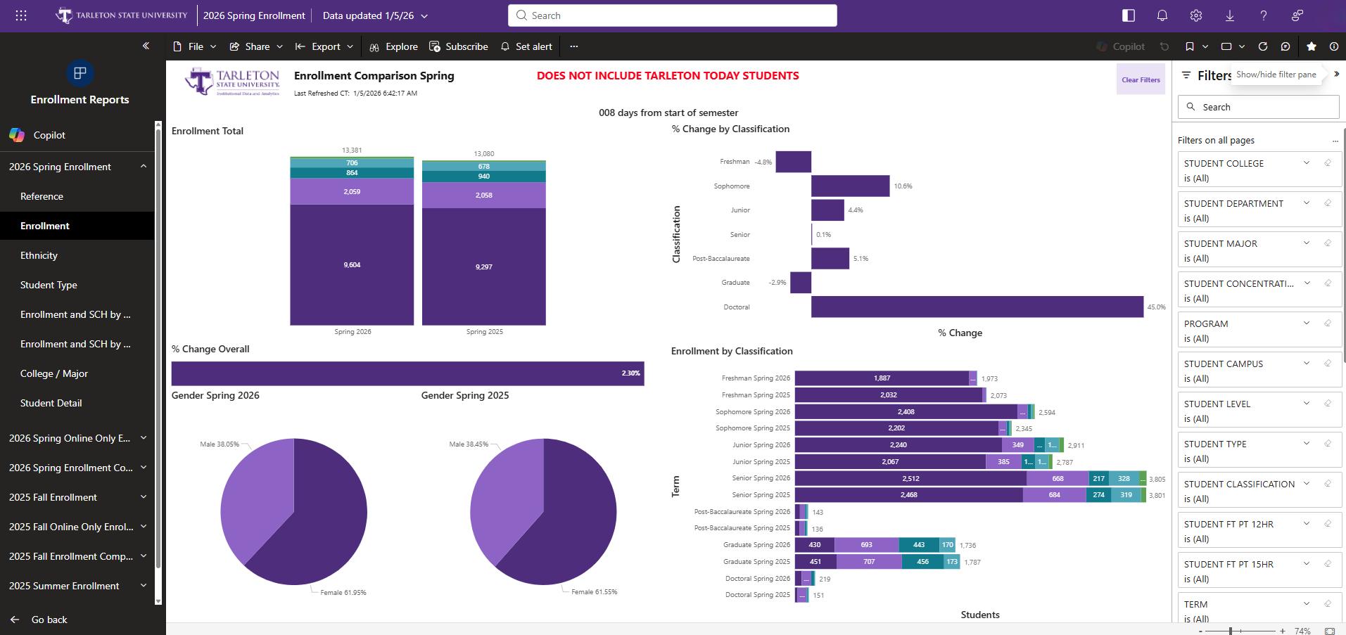 This dashboard provides a visual analysis of enrollment trends for Spring 2026 compared to Spring 2025. It highlights overall enrollment growth, with detailed breakdowns by student classification, gender and academic level. Key visualizations include stacked bar charts comparing total enrollment across semesters, a percentage change chart by classification, gender distribution pie charts, and a comprehensive enrollment-by-classification chart. Interactive filters allow segmentation by college, department, major, campus, term and other variables, offering a dynamic view of enrollment patterns and institutional growth.