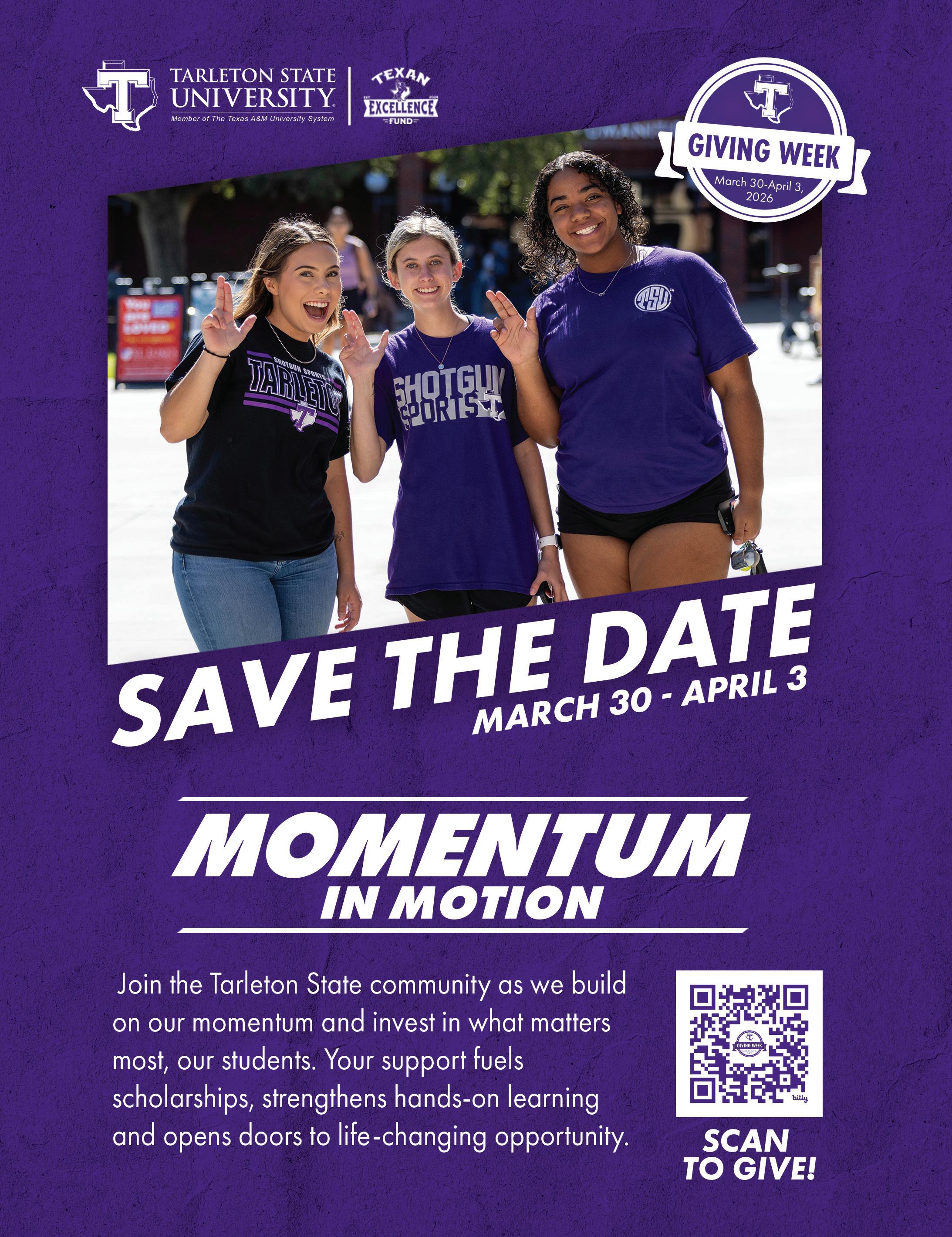 Know a student whose success reflects the generosity of our donors? Or a faculty or staff member who gives graciously? Send nominations to Raiford Ramirez, Director of Development Communications and Content Creation, at rramirez1@tarleton.edu.