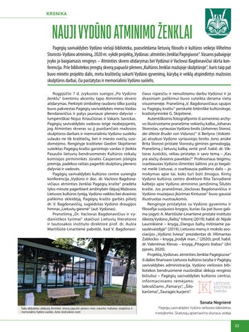 NAUJI VYDŪNO ATMINIMO ŽENKLAI Pagėgių savivaldybės Vydūno viešoji biblioteka, puoselėdama lietuvių filosofo ir kultūros veikėjo Vilhelmo Storosto-Vydūno atminimą, 2020 m. vykdė projektą „Vydūnas: atminties ženklai Pagėgiuose“. Vasaros pabaigoje įvyko jo baigiamasis renginys – Atminties skvero atidarymas bei Vydūnui ir Vaclovui Bagdonavičiui skirta konferencija. Prie bibliotekos įrengtą skverą papuošė plenero „Kultūros ženklai mažojoje skulptūroje“, kuris taip pat buvo minėto projekto dalis, metu kraštiečių sukurti Vydūno gyvenimą, kūrybą ir veiklą atspindintys mažosios skulptūros darbai, čia pastatytas ir memorialinis Vydūno suolelis. Rugpjūčio 7 d. įvykusios sueigos „Po Vydūno ženklu“ šventiniu akcentu tapo Atminties skvero atidarymas. Perkirpti simbolinę raudono šilko juostą buvo pakviestas Pagėgių savivaldybės meras Vaidas Bendaravičius ir patys jauniausi plenero dalyviai – lumpėniškiai Nojus Kriaučiūnas ir Vakaris Savickas. Pagėgių savivaldybės vadovas teigė neabejojantis, jog Atminties skveras su jį puošiančiais mažosios skulptūros darbais ir memorialiniu Vydūno suoleliu sulauks ne tik kraštiečių, bet ir miesto svečių susi domėjimo. Renginyje kraštietei Giedrei Skipitienei suteiktas Pagėgių krašto garsintojo vardas ir įteikta Pasaulio lietuvių bendruomenės Kultūros reikalų komisijos pirmininkės Jūratės Caspersen įsteigta premija, padėkos raštais pagerbti skulptūrų plenero dalyviai ir vadovės. Pagėgių savivaldybės kultūros centre surengta konferencija „Vydūno ir doc. dr. Vaclovo Bagdona vičiaus atminties ženklai Pagėgių krašte“ pradėta tylos minute pagerbiant amžinybėn išėjusį Mažosios Lietuvos kultūros tyrėją, Vydūno veiklos bei dvasinio palikimo skleidėją, Pagėgių krašto garbės pilietį dr. V. Bagdonavičių, sugiedotas Vydūno draugijos himnas „Lietuvių giesmė“ (aut. Vydūnas). Pranešimą „Dr. Vaclovas Bagdonavičius ir vy dūnistikos tyrimai“ skaičiusi Lietuvių literatūros ir tautosakos instituto direktorė prof. dr. Aušra Martišiūtė-Linartienė pabrėžė, kad V. Bagdonavi